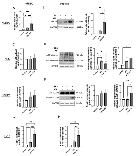 Inflammasome activation was induced by priming the cells with 1 µg/mL LPS for 24 h, followed by ATP incubation at 5 mM concentration for 1 h prior to the end of the exposure period. To distinguish the effects of LPS alone, cells incubated without ATP were also analyzed.