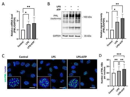 Figure 2. Inflammasome activation by LPS and ATP induces PML upregulation and more PML-NBs formation in EA.hy926 cells. (A,B) mRNA and protein levels of PML in EA.hy926 cells after incubation with LPS (1 µg/mL) for 24 h, with or without subsequent ATP (5 mM) stimulation for 1 h. Levels were quantified by RT-qPCR or immunoblotting of total protein lysates. mRNA values are shown relative to controls. n = 6, two-way ANOVA. Representative immunoblots from n = 4 experiments, two-way ANOVA. (C) Immunocytochemistry of EA.hy926 cells stained with anti-PML (green) and Draq5 for nuclei (blue). Representative images from n = 3 experiments. Scale bar: 20 µm. (D) The numbers of PML-NBs in nuclei of EA.hy926 incubated with LPS (1 µg/mL) for 24 h, with or without subsequent ATP (5 mM) stimulation for 1 h, were counted and compared to the numbers of PML-NBs in control cells. n = 60 from 3 independent experiments. All graphs are presented as mean ± SD. * p < 0.05, ** p < 0.01, *** p < 0.001.