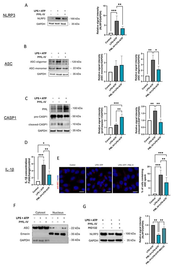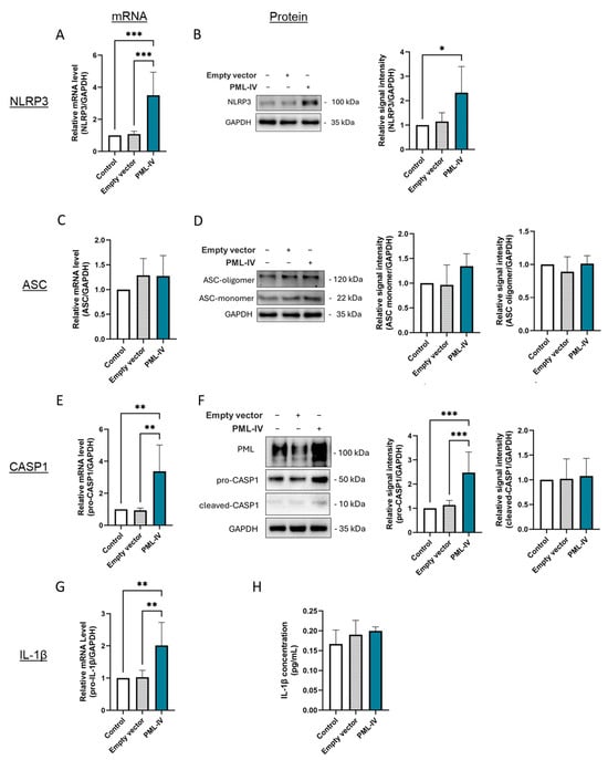 Figure 3. The effect of PML on LPS- and ATP-independent inflammasome activation in EA.hy926 cells. (AG) mRNA and protein levels of inflammasome markers were measured in cells transfected with either an empty vector or pEGFP-C1-PML-IV (=PML-IV). mRNA and protein levels of NLRP3 (A,B), ASC (C,D), caspase-1 (E,F), and IL-1β (G) were quantified using RT-qPCR or immunoblotting of total protein lysates. Expression values are shown relative to controls (non-transfected cells). n = 6, one-way ANOVA. Representative immunoblots from n = 4–6 experiments, one-way ANOVA. (H) Determination of IL-1β protein levels in supernatants of EA.hy926 cells after transfection with a vector lacking a specific gene insert or a pEGFP-C1-PML-IV-vector. Expression values are shown relative to controls. n = 4 experiments, one-way ANOVA. All graphs are presented as mean ± SD. * p < 0.05, ** p < 0.01, *** p < 0.001.