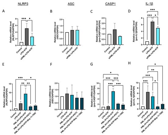 Figure 4. PML influences via NF-kB the mRNA levels of inflammasome markers after its activation by LPS and ATP in EA.hy926 cells. (AD) The mRNA levels of inflammasome markers were determined in EA.hy926 cells after incubation with LPS (1 µg/mL) and ATP (5 mM) with or without transfection with PML-specific siRNAs (siPML). The mRNA levels of NLRP3 (A), ASC (B), pro-caspase-1 (C), and IL-1β (D) were quantified using RT-qPCR. Expression values are shown relative to controls. n = 3–4, two-way ANOVA. (EH) The mRNA levels of inflammasome markers were determined in EA.hy926 cells after incubation with LPS (1 µg/mL) and ATP (5 mM) with or without transfection with the pEGFP-C1-PML-IV vector (=PML-IV) and additional PDTC (10 μM) or Bay 11-7082 (10 µM) treatment. The mRNA levels of NLRP3 (E), ASC (F), caspase-1 (G), and IL-1β (H) were quantified using RT-qPCR. Expression values are shown relative to controls. n = 7, two-way ANOVA. All graphs are presented as mean ± SD. * p < 0.05, ** p < 0.01, *** p < 0.001.