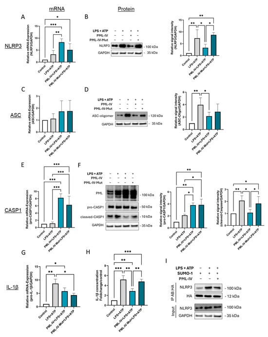 Figure 6. SUMOylation of PML is obligatory to inhibit inflammasome activation of EA.hy926 cells. (AG) mRNA and protein levels of inflammasome markers in EA.hy926 cells after incubation with LPS (1 µg/mL) and ATP (5 mM) with or without transfection with the wild-type PML-IV vector (=PML-IV) or a SUMO-defective PML-IV vector (=PML-IV-Mut). mRNA and protein levels of NLRP3 (A,B), ASC (C,D), caspase-1 (E,F), and IL-1β (G) were quantified using RT-qPCR or immunoblotting of total protein lysates. Expression values are shown relative to controls. n = 4–6, two-way ANOVA. Representative immunoblots from n = 3–4 experiments, two-way ANOVA. (H) Determination of IL-1β protein levels in supernatants of EA.hy926 cells after incubation with LPS (1 µg/mL) and ATP (5 mM) with or without transfection with the pEGFP-C1-PML-IV vector or a SUMO-defective PML-IV vector. Expression values are shown relative to controls. n = 4 experiments, two-way ANOVA. (I) EA.hy926 cells were transfected with pcDNA3-HA-SUMO1 expression vector, either alone or in combination with pEGFP-C1-PML-IV, and subsequently treated with LPS (1 µg/mL) and ATP (5 mM) as indicated. Cell lysates were subjected to immunoprecipitation using anti-HA antibodies to isolate SUMOylated proteins. Imunmunoprecipitates were analyzed by immunoblotting for NLRP3 to assess its SUMOylation status. n = 3. All graphs are presented as mean ± SD. * p < 0.05, ** p < 0.01, *** p < 0.001.