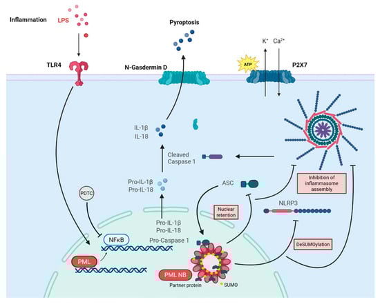 45. Dowling, J.K.; Becker, C.E.; Bourke, N.M.; Corr, S.C.; Connolly, D.J.; Quinn, S.R.; Pandolfi, P.P.; Mansell, A.; O’Neill, L.A.J. Promyelocytic leukemia protein interacts with the apoptosis-associated speck-like protein to limit inflammasome activation. J. Biol. Chem. 2014, 289, 6429–6437. [Google Scholar] [CrossRef]