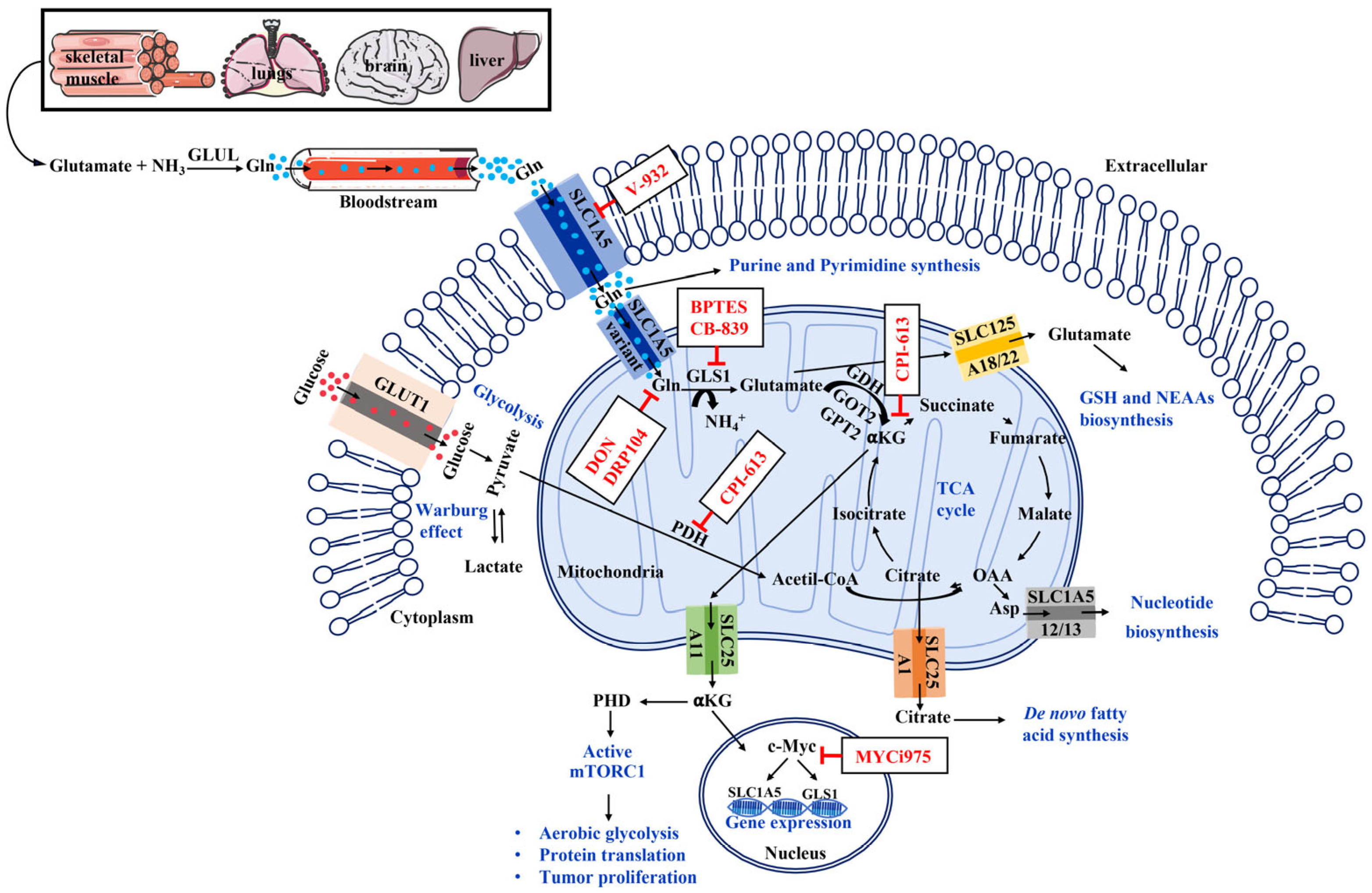 | BPTES | GLS1 inhibitor | Selective inhibition of GLS1 enzyme blocks Gln conversion to glutamate. | [58] |