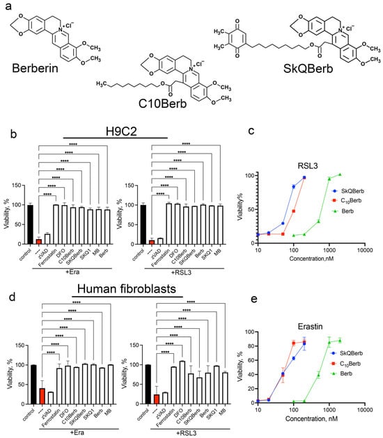 Figure 1. Berberine and its derivatives protected H9c2 cardiomyocytes and human diploid fibroblast from ferroptosis induced by erastin and RSL3. (a) Chemical structures of berberine, C10Berb and SkQBerb (b,d) Cells were incubated with 5 µM erastin or 200 nM RSL3 alone and in combination with 10 µM zVADfmk (zVAD), 10 µM ferrostatin-1, 100 µM deferoxamine (DFO), 100 nM C10Berb, 100 nM SkQBerb, 10 µM berberine (Berb), 100 nM SkQ1, or 250 nM methylene blue (MB) for 24 h. p < 0.0001 ****—significance of differences between erastin- or RSL3-treated samples and other samples (n = 6). (c,e) Protective efficacy of C10Berb, SKQBerb and berberine (Berb) against ferroptosis induced by RSL3 (200 nM) or erastin (5 µM) in H9c2 cardiomyocytes. Cell viability was measured after 24 h using the CellTiterBlue reagent.