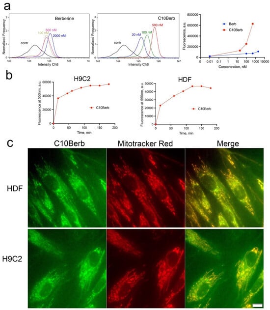 Figure 2. Accumulation of C10Berb and berberine in H9c2 cardiomyocytes and in human diploid fibroblasts (HDF). (a). H9c2 cardiomyocytes were incubated with C10Berb or berberine (Berb) at indicated concentrations for 1 h then washed with PBS and analyzed using an Amnis FlowSight flow cytometer. (b) Cells were incubated with 500 nM C10Berb for indicated periods, washed with PBS, suspended in PBS with 1% SDS and fluorescence was measured at 550 nm (excitation at 365 nm) using FluoroMax-3 spectrofluorometer. (c) Localization of C10Berb in H9C2 cells or in HDF was analyzed after incubation with 100 nM C10Berb for 1 h followed by staining of mitochondria with MitoTracker Red (100 nM, 15 min). Fluorescence was analyzed using a fluorescence microscope Olympus IX 83 (Tokyo, Japan). Bar—20 µm.