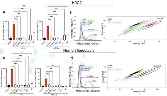 Figure 4. Erastin and RSL3 induce mitochondrial lipid peroxidation (LPO) in H9c2 cardiomyocytes and human fibroblasts. Cells were incubated with 5 µM erastin or 100 nM RSL3 alone and in combination with 100 nM C10Berb, 100 nM SkQBerb, 10 µM Berb, 100 µM DFO, 100 nM SkQ1, and 250 nM MB for 18 h. Mitochondria-targeted fluorescent ratiometric probe MitoCLox was added for 18 h. (ad) Ratio of green/red fluorescence was measured and analyzed using gating procedure. p < 0.0001 ****—significance of the difference between samples treated with erastin or RSL3 and other samples (n = 6). (b,d) Representative histograms and dot plots illustrating the gating procedure.
