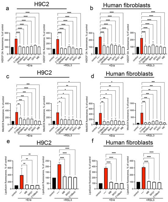 Figure 5. Erastin and RSL3 induce the production of mitochondrial superoxide anion and cytosolic ROS. Cells were incubated with 5 µM erastin or 100 nM RSL3 alone and in combination with 100 nM C10Berb, 100 nM SkQBerb, 10 µM Berb, 100 nM SkQ1, 100 µM DFO and 250 nM MB for 18 h. Cells were stained with 1.8 µM CM-H2DCFDA (a,b) or with 1 µM MitoSOX (c,d) for 30 min. Lipofuscin accumulation was measured by autofluorescence (e,f). The fluorescence of control samples was taken as 100% p < 0.0001 ****, p ≤ 0.001 ***, 0.05 ≥ p > 0.001 **, p < 0.05 *—significance of the difference between samples treated with erastin or RSL3 and other samples (n = 4). Representative flow cytometry plots corresponding to this figure are shown in Figure S4.