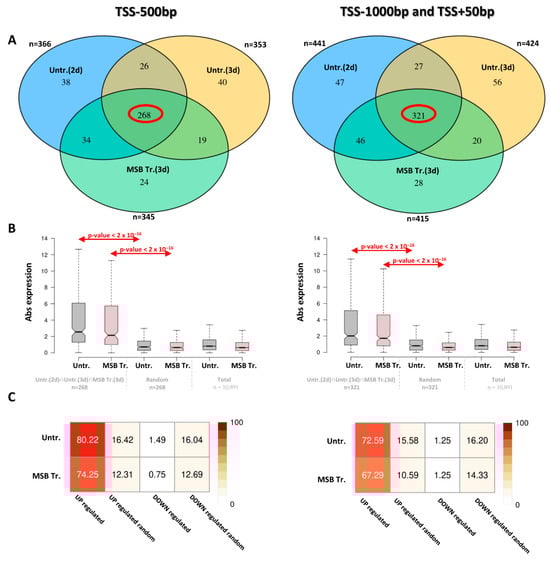 All protein-encoding genes with an AtfA ChIP-seq peak in their upstream regions (upstream of TSS, 5′ UTR) were compiled independently of culture conditions, and the total numbers of loci with an AtfA ChIP-seq peak in their −500 bp–TSS and −1000 to +50 bp from TSS regions were 449 and 545, respectively (Table S2). Importantly, as many as 268 and 321 loci (Table S2) were detected in the −500 bp–TSS and −1000 to +50 bp from TSS regions, respectively, which were recognized by AtfA in at least one replicate under each of the three culture conditions (2-day unstressed, 3-day unstressed, and MSB-treated) (Figure 3A). In both sets of these overlapping loci, the occurrences of significant gene expression changes (upregulated and downregulated combined, 3 d conidiospores [5]) were significantly higher than in either randomly selected gene sets or in the full genomic gene set (Wilcoxon test, p < 0.001; Figure 3B,C). Moreover, genes associated with an AtfA ChIP-seq peak were predominantly upregulated in the presence of functional AtfA (Figure 3C); this effect was not observed in size-matched random gene sets. This observation clearly indicates that AtfA is a positive-acting transcriptional regulator with a few exceptions, which is in line with the data gained previously with S. pombe Atf1 [19].
