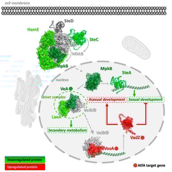 As previous global gene expression data indicated [5], three genes encoding the components of the SteC-MkkB-MpkB-SteD-HamE pheromone module regulating stress responses, secondary metabolism, and asexual development in Aspergillus colonies [50,51], the mpkB and steC protein kinase and hamE scaffold protein genes, are under negative AtfA control in the wt strain, together with the velvet regulator veA, the sexual transcription factor steA, and the methyltransferase-domain protein laeA genes (Figure 5). Importantly, only veA possesses an AtfA-bound promoter showing altered expression in ΔatfA compared with wild-type (Figure 4 and Figure 5), and flbD coding for an early, c-Myb transcriptional activator of asexual development [52,53] was also negatively affected (Unstr. only) by AtfA (Figure 4). Because AtfA is typically a positive transcriptional regulator (Figure 3), its effect on veA and flbD expression may be overcompensated by other not-yet-identified transcriptional regulators.