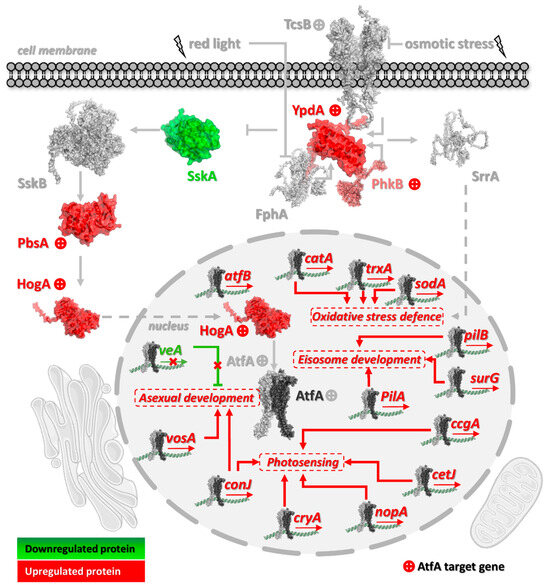 Expression changes in the HogA pathway components in response to the AtfA transcription factor found in A. nidulans conidia. Red indicates increased expression, green indicates decreased expression, and gray indicates no change. Components marked with a “+” symbol are those with an identified ChIP-seq peak. Protein structures were visualized using AlphaFold3 predictions (Table S5). Solid arrows represent regulatory effects, while dashed arrows indicate nuclear transport. The lightning symbol represents the external environmental signal (two types: red light and osmotic stress). In the nucleus, predicted target genes of homodimeric AtfA are shown (only a subset of key targets is displayed).