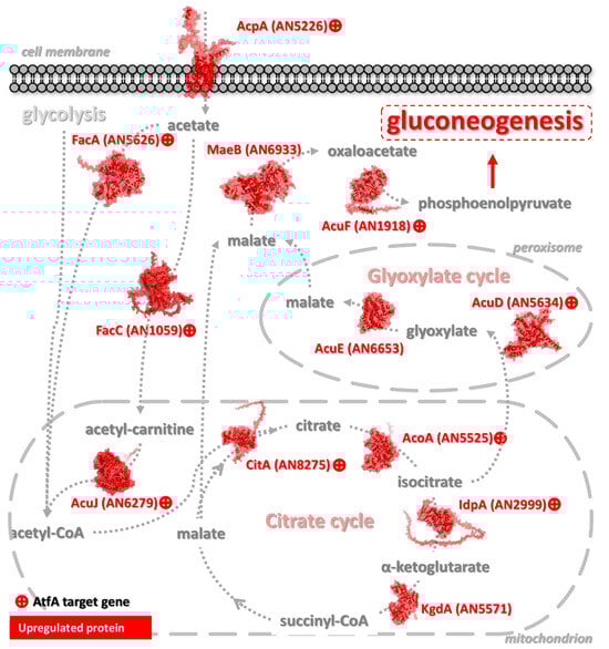 Changes in the central primary metabolic pathways TCA and glyoxylate cycles and acetate utilization in response to the AtfA transcription factor. The conversion and movement of precursors and intermediates, as well as the direction of the associated processes, are indicated by dashed arrows. Proteins catalyzing the respective reactions were visualized using AlphaFold3 predictions (Table S5). Only proteins showing expression changes are included in the schematic, where red indicates increased expression. A “+” symbol denotes genes with a ChIP-seq peak identified in their promoter region.