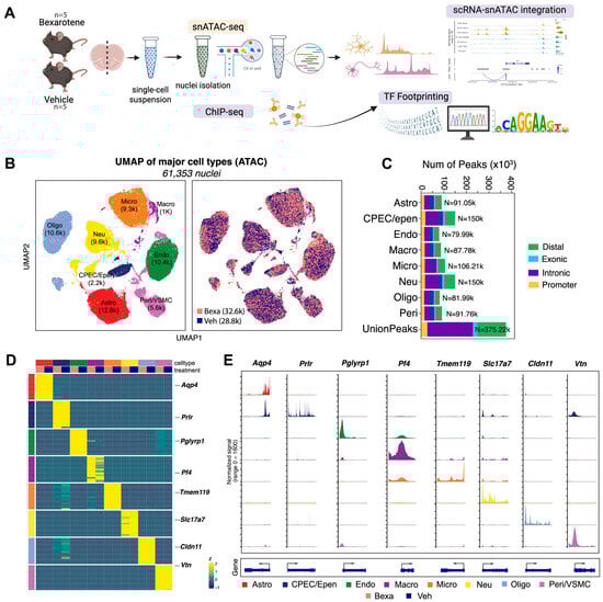 (A) Experimental design. APP/PS1 mice (5 months old, male and female) were treated with RXR agonist (Bexa; 100 mg/kg/day, oral) or Vehicle (corn oil with 1% DMSO) for 10 days. Brains were dissociated into single-cell suspensions and processed for snATAC-seq (Bexa, n = 5; Veh, n = 5) library preparation using the 10x Genomics Chromium platform. (B) UMAP projections showing sample treatment distribution across integrated scRNA-seq and snATAC-seq datasets. Major cell types are annotated as Astro (astrocytes), CPEC/Epen (choroid plexus epithelial/ependymal cells), Endo (endothelial cells), Macro (macrophages), Micro (microglia), Neu (neurons), Oligo (oligodendrocytes), and Peri/VSMC (pericytes/vascular smooth muscle cells). (C) Proportions of annotated peak distributions across major cell-type groups (n = 5 per group). (D) Heatmap showing normalized expression of top marker genes for each cell type. (E) Coverage plots showing chromatin accessibility across major cell types for representative marker genes.