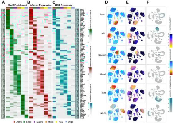 (A–C) Heatmaps of 88 candidate transcription factor (TF) regulators across major cell types shown as chromVar motif enrichment (A), inferred gene expression (B), ATAC gene-score from ArchR), and RNA expression level ((C), from scRNA-seq). The two side panels show Pearson correlations between ATAC-inferred TF expression and chromVar (left, highlighted in green) or gene expression (right, highlighted in cyan). (D–F) UMAP embeddings of example candidate TF regulators as of motif enrichment (D) and inferred gene expression (E) from ATAC-seq (ArchR), as well as gene expression (F) from RNA profile (Seurat). The examples of cell-specific TF regulators are Pax6 in astrocytes, Lef1 in endothelial cells, Neurod6 in neurons, Runx3 in macrophages, Mafb in microglia, and Nfe2l3 in oligodendrocytes.
