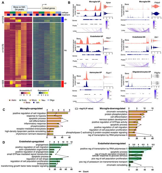(A) Heatmap of differentially accessible peaks (left) and their linked genes (right) between RXR-activated and Vehicle-treated groups across major cell types. Peaks are categorized as downregulated (dn, n = 1310), non-significant (ns, n = 14,170), or upregulated (up, n = 1685) based on Bexarotene vs. Vehicle comparison (adjusted p-value < 0.05). Samples are grouped by cell type and treatment. Z-scores are shown for both accessibility and expression levels. (B) Coverage plots of differentially accessible peaks in representative loci, including gene annotations, peak coordinates, genomic links, and expression levels under each condition. Shown are representative peaks at adjusted p values < 0.05 and DEG. Details in the text of the results. (C,D) GO enrichment analysis of biological processes associated with more accessible peaks and upregulated genes (left) or less accessible peaks and downregulated peaks (right) in microglia (C) and endothelial cells (D) following RXR activation.