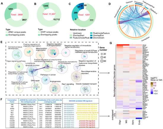 (A–C) Number of unique and overlapping peaks identified by ATAC-seq and ChIP-seq and their relative positions with respect to nearest gene features. (D) Circos plot visualizing overlap among gene lists from RXR ChIP-seq binding and ATAC-seq motif enrichment. Outer arcs = gene lists; inner arcs = member genes. Dark orange = shared genes; light orange = unique genes. Purple lines link genes present in multiple lists; blue lines link genes under the same significantly enriched ontology term. (E) Network of enriched pathways associated with genes overlapping ATAC-seq and ChIP-seq peaks. Dot size = number of enriched genes; sector area = proportion of overlapping genes in each category. GO and pathway enrichment were performed with Metascape and visualized with Cytoscape. (F) Table of TF names, JASPAR RXRα (PPARγ::RXRα) motifs, and coordinates within overlapping ATAC-seq/ChIP-seq peaks and ENCODE cCRE signatures. Because ChIP-seq was performed with an RXR antibody, only RXR homo- and heterodimer motifs are included. (G) Heatmap of log2FC expression for genes near overlapping ATAC-seq and ChIP-seq peaks that are implicated in neurodegenerative disorders. Lower panel: cell-type-specific expression of TFs located near overlapping peaks.
