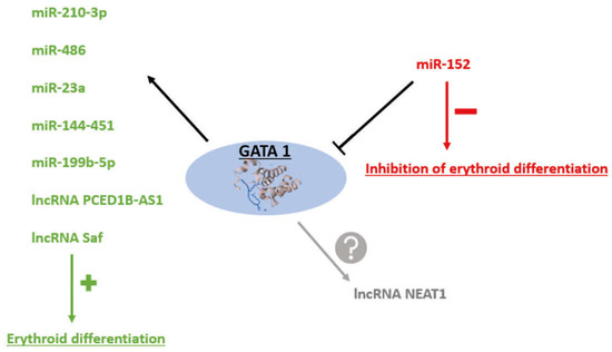 Mice lacking miR-144/451 suffer from blocked erythroid differentiation, with increased c-Myc expression. The miR-144/451 cluster is involved in erythroid differentiation by targeting the transcription factor c-Myc. During erythroid differentiation, GATA1 expression increases, while, conversely, Myc protein levels decrease. This increase in GATA1 enables the activation of miR-144/451 expression, thereby blocking c-Myc expression at the post-transcriptional level. This regulatory process promotes erythroid differentiation. Additionally, GATA1 directly inhibits c-Myc and a positive regulator of miR-144/451 (Figure 4). Thus, there is a link between GATA1-miR-144/451-Myc in the regulation of erythroid differentiation [63]. Another miRNA, miR-152, also represses GATA1 expression during erythropoiesis [64] (Figure 4).