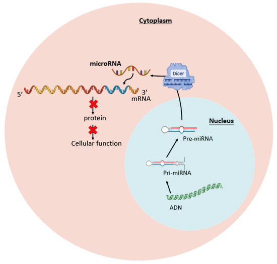 The first miRNA, lin-4, was discovered in 1993 by Victor Ambros and Gary Ruvkun, but it was not until 2002 that a role for miRNAs in pathology was suggested, initially in cancer, and then in 2004 in hematopoietic diseases, among others [27]. Since then, miRNAs have been studied in more detail and their field of application has expanded to many areas [28]. Their importance in the gene regulation field explains the 2024 Nobel Prize in Physiology and Medicine [29]. It is well established that miRNAs are small non-coding RNAs of approximately 25 nucleotides, which regulate gene expression at the post-transcriptional level by binding to the 3′UTR part of the mRNA. This binding will lead to inhibition of translation or degradation of the mRNA. In this review, the details of the biogenesis of miRNAs will not be discussed (Figure 3) [28,30,31]. Thus, miRNAs can be involved in the regulation of genes controlling apoptosis, proliferation, differentiation, and cell metastasis [28,30]. For example, miR144/451 knockout (KO) mice present severe anemia with alteration of erythropoiesis, including apoptosis of erythroblasts [32]. In biological fluids, miRNAs can also be detected within microparticles and exosomes, allowing their use as biomarkers in serum, plasma, urine, and saliva [28,33]. For example, an increase in plasma levels of miR-451 could be associated with the degree of hemolysis in patients with β-thalassemia/hemoglobin E (β-thal/HbE), allowing it to serve as a potential biomarker for intravascular hemolysis in these patients [34].