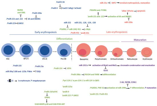 miRNAs and different stages of normal erythropoiesis. The different stages of erythropoiesis are classified into two categories: early erythropoiesis (in blue) and late erythropoiesis (in red). Within these two categories, we refer to erythroid differentiation (from the HSC stage to the orthochromatic stage, in green) and maturation (from the erythroblast stage to the erythrocyte stage, in purple). In each category, miRNAs have specific expression patterns. Some are more involved in early erythropoiesis and differentiation, while others are more involved in late erythropoiesis and maturation. This figure shows the variations in the expression of these miRNAs and the specific targets that they inhibit. The ✕ symbol illustrates that the expression of miR-22 leads to a decrease in the number of erythrocytes and an increase in the number of megakaryocytes. During physiological erythropoiesis, this microRNA is therefore absent.