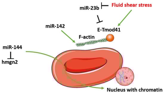 miRNAs and erythrocyte morphology. The morphology of red blood cells (RBCs) is regulated by microRNAs (miRNAs), including miR-23b, miR-142 and miR-144. F-actin dynamics are modulated by miR-142, while miR-23b inhibits the erythrocyte tropomodulin of 41kDa (E-Tmod41). However, miR-23b itself is downregulated by fluid shear stress, leading to the activation of E-Tmod41 and actin filaments (F-actin), which ensures proper organization of the membrane cytoskeleton. Additionally, miR-144 promotes chromatin condensation by targeting the chromatin-associated high mobility group protein N2 (HMGN2), facilitating nuclear extrusion and erythrocyte maturation.