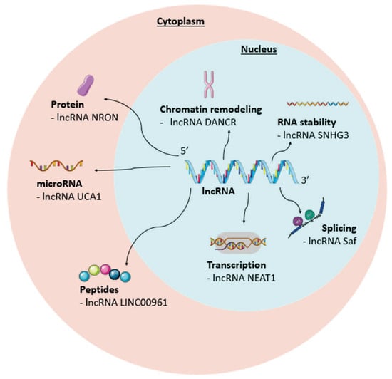 It is well established that lncRNAs are defined as transcripts of more than 200 nts, transcribed by polymerase II, with a 5′ end, polyadenylated tail, and splicing [80]. Their expression levels are lower than those of protein-coding genes and are more specific to a particular cell type [15]. However, due to their structural diversity, the mechanisms of action of lncRNAs are more varied and complex than those of miRNAs [15]. They can act in the nucleus, where they are involved in chromatin remodeling, transcription, pre-mRNA splicing, and RNA stability (Figure 6) [15]. In the cytoplasm, they can bind to anchoring proteins or to RNA as “microRNA sponges,” thus inactivating them by binding them in a complementary manner and diverting them from their target mRNAs (Figure 6) [15]. Based on their genomic location relative to protein-coding genes, lncRNAs can be categorized into different subgroups such as intergenic (lincRNAs), transcribed from the same promoter as a protein-coding gene (pancRNA), associated with an enhancer (eRNA), and circular (circRNAs). Other categories of lncRNAs also exist, such as promoter-associated long non-coding RNAs (plnRNAs), antisense long non-coding RNAs (alncRNAs), short half-life long non-coding RNAs (shlncRNAs) and enhancer long non-coding RNAs (elncRNAs). However, some lncRNAs do not fit into these categories, demonstrating the complexity of studying these non-coding RNAs [10,82].