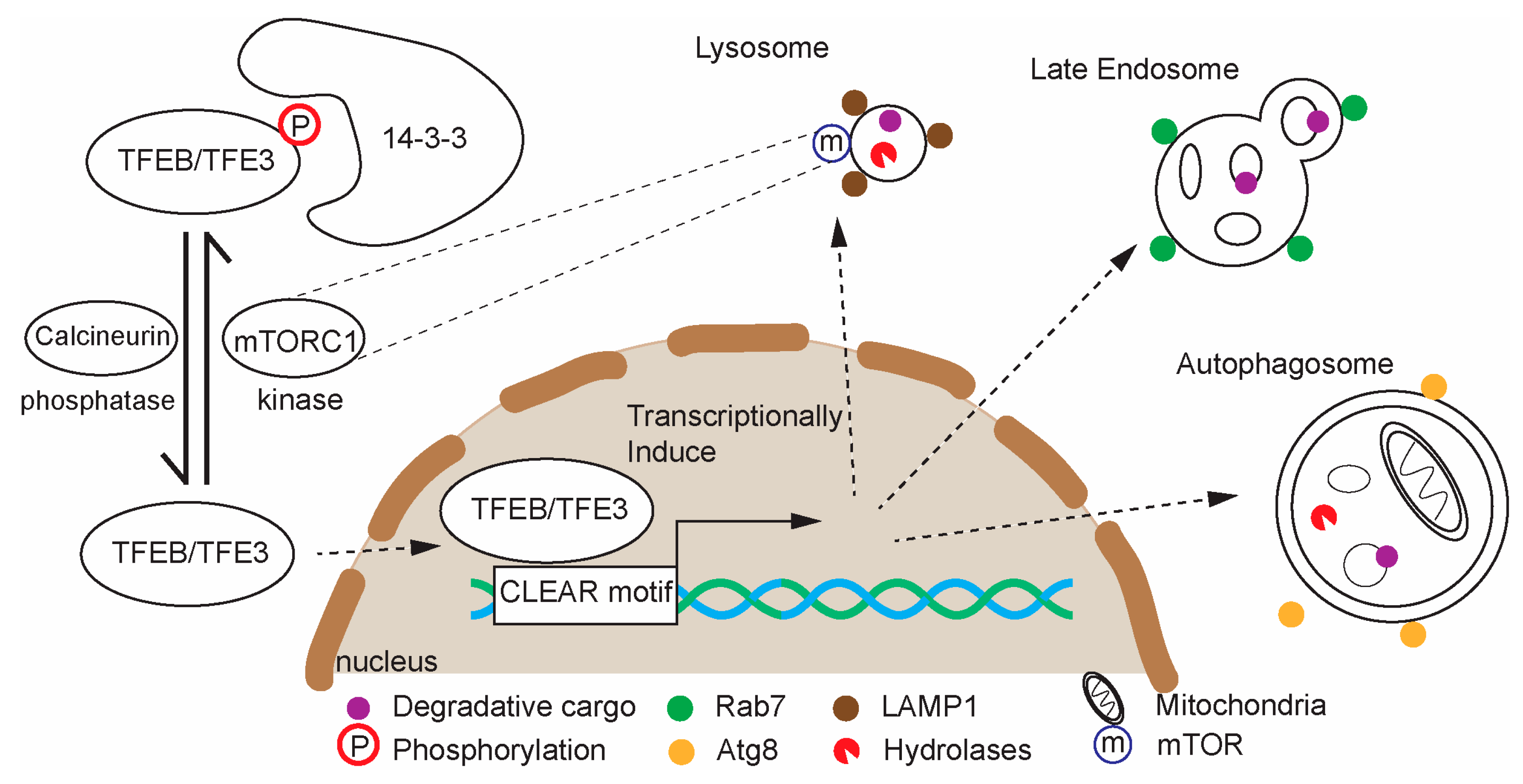 - Stress-responsive expansion of lysosomal capacity: Efflux of Ca2+ from the lysosomal lumen can activate calcineurin, which dephosphorylates TFEB to promote transcriptional expansion of lysosomal and autophagic capacity [85]. The CASM machinery also facilitates activation of TFEB/TFE3 during lysosomal stress [278].