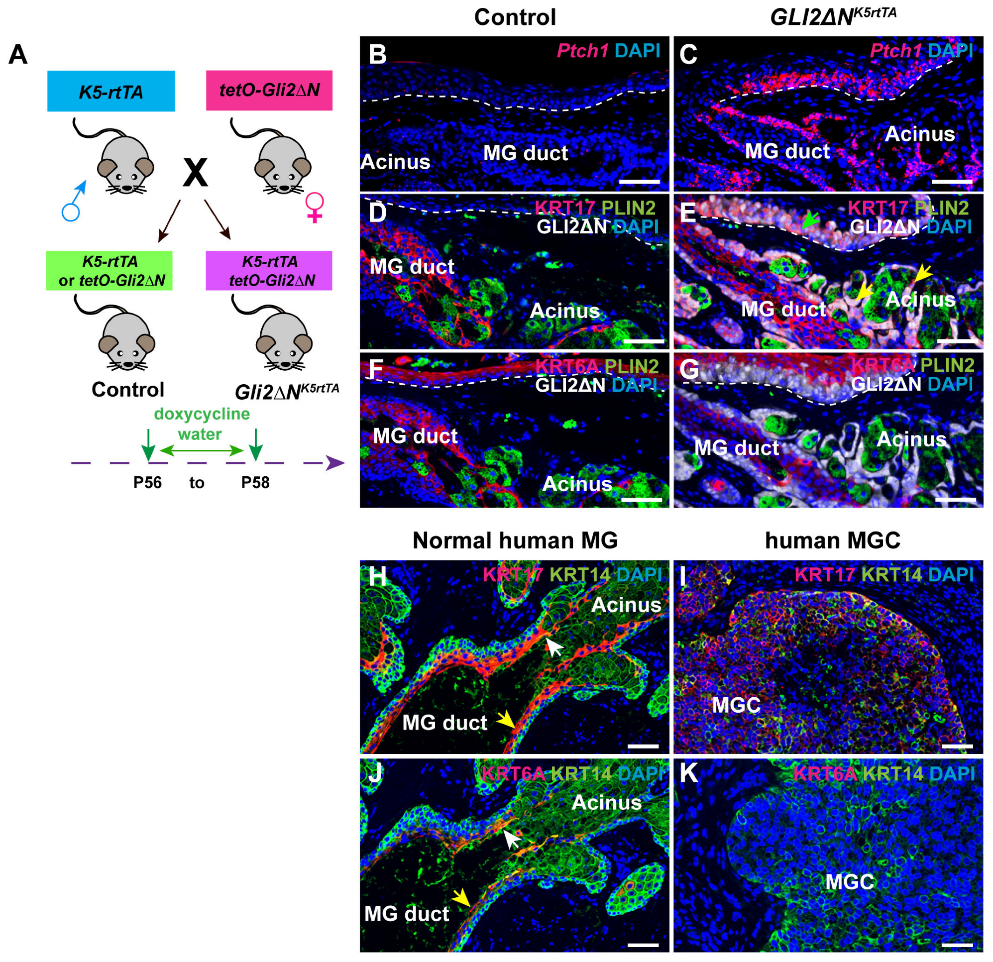 3.4. Forced Activation of the Hh Signaling Pathway Induces KRT17, but Not KRT6A Expression, in Adult MG and PC Epithelia, and KRT17 Is Broadly Expressed in Human MGC Samples