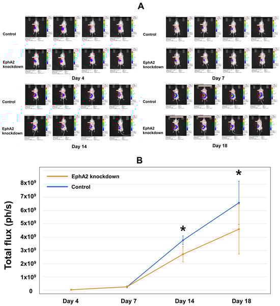 Following the injection of EphA2 or control shRNA Renca–Luc cells into the mouse kidney to generate the orthotopic RCC tumor model, luciferase activity in the ROI was determined as the total flux using in vivo BLI (Figure 2A). The total flux gradually increased until day 7 and then rapidly increased thereafter (Figure 2B). The mean total flux was significantly lower in the EphA2-knockdown group than in the control group on day 14 (mean ± standard deviation: 2.71 × 109 ± 0.59 × 109 vs. 3.63 × 109 ± 0.21 × 109, p = 0.021) and was further decreased in the EphA2-knockdown group compared to that in the control group by day 18 (4.60 × 109 ± 0.19 × 109 vs. 6.59 × 109 ± 0.16 × 109, p = 0.043).