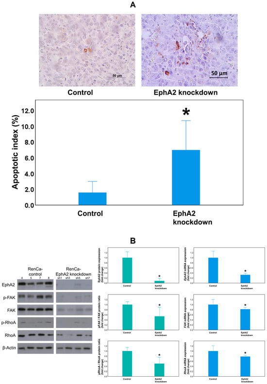 The EphA2-knockdown group showed increased apoptosis of tumor cells and decreased EphA2/FAK/RhoA signaling pathway expression. (A) Representative images from TUNEL staining (top) and quantitation of the tumor cell apoptotic index in each group (* p = 0.021). The EphA2/FAK/RhoA signaling pathway was evaluated by (B) Western blot analysis of EphA2, pFAK/FAK, and pRhoA/RhoA expression in protein lysates obtained from orthotopic RCC tumors of the control (RenCa-control) and EphA2-knockdown (RenCa–EphA2 shRNA) groups (β-actin as a loading control). RT-qPCR analysis of EphA2, FAK, and RhoA mRNA expression in corresponding tumor tissues (β-actin as an internal control). Quantification of the results is shown. * (B): p = 0.025 (Epha2 protein), p = 0.034 (phosphorylated FAK (pFAK)/FAK protein), p = 0.014 (phosphorylated RhoA (pRhoA)/RhoA protein); p = 0.001 (Epha2 mRNA), p = 0.042 (FAK mRNA), p = 0.049 (RhoA mRNA). EphA2 = EphrinA2; FAK = focal adhesion kinase; RhoA = Ras homolog family member A; RT-qPCR = real-time quantitative reverse transcription–polymerase chain reaction.