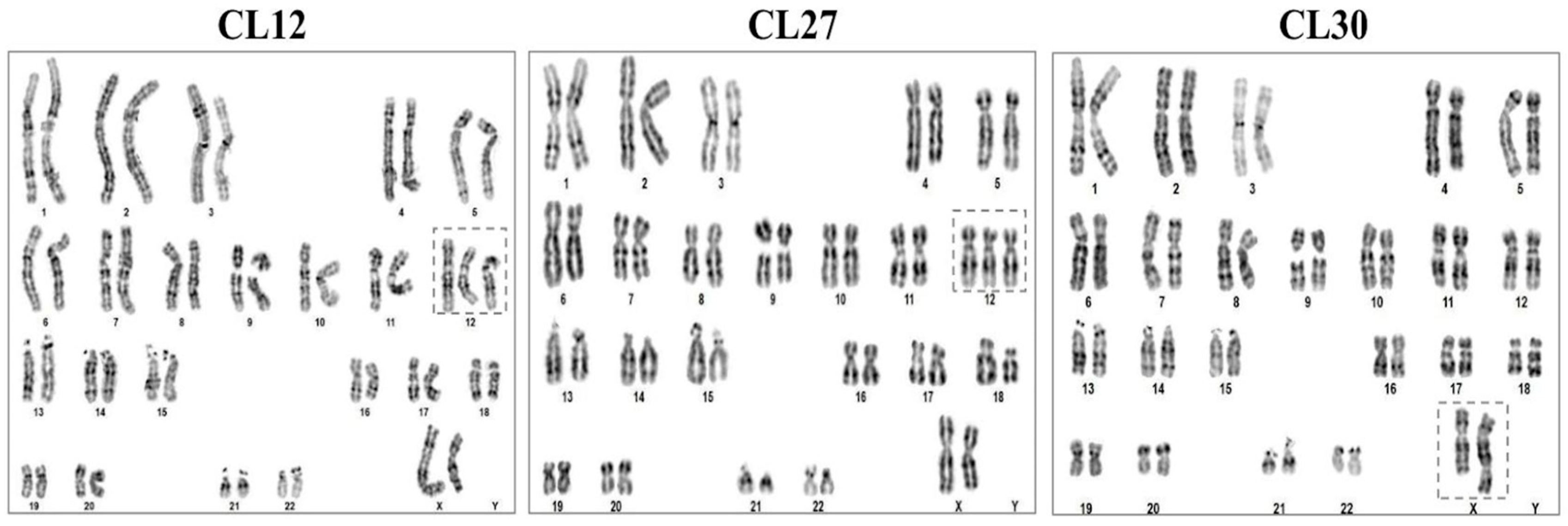 This cytogenetic analysis revealed that all three lines had acquired distinct chromosomal abnormalities, indicating the emergence of genomic instability during in vitro culture. The line CL12 exhibited trisomy of chromosome 12, identified in 4 of 17 metaphases (~23.5%). The line CL27 displayed the same trisomy 12 aberration but at a higher frequency, observed in 12 of 31 cells (~38.7%), suggesting progressive clonal selection. In contrast, the line CL30 harbored a derivative X chromosome, which was detected in 5 out of 36 analyzed metaphases (~13.9%) (Figure 2). All analyzed cells maintained a 46,XX karyotypic background. The acquisition of trisomy 12 is consistent with recognized culture-adapted mutations in pluripotent stem cells [25].