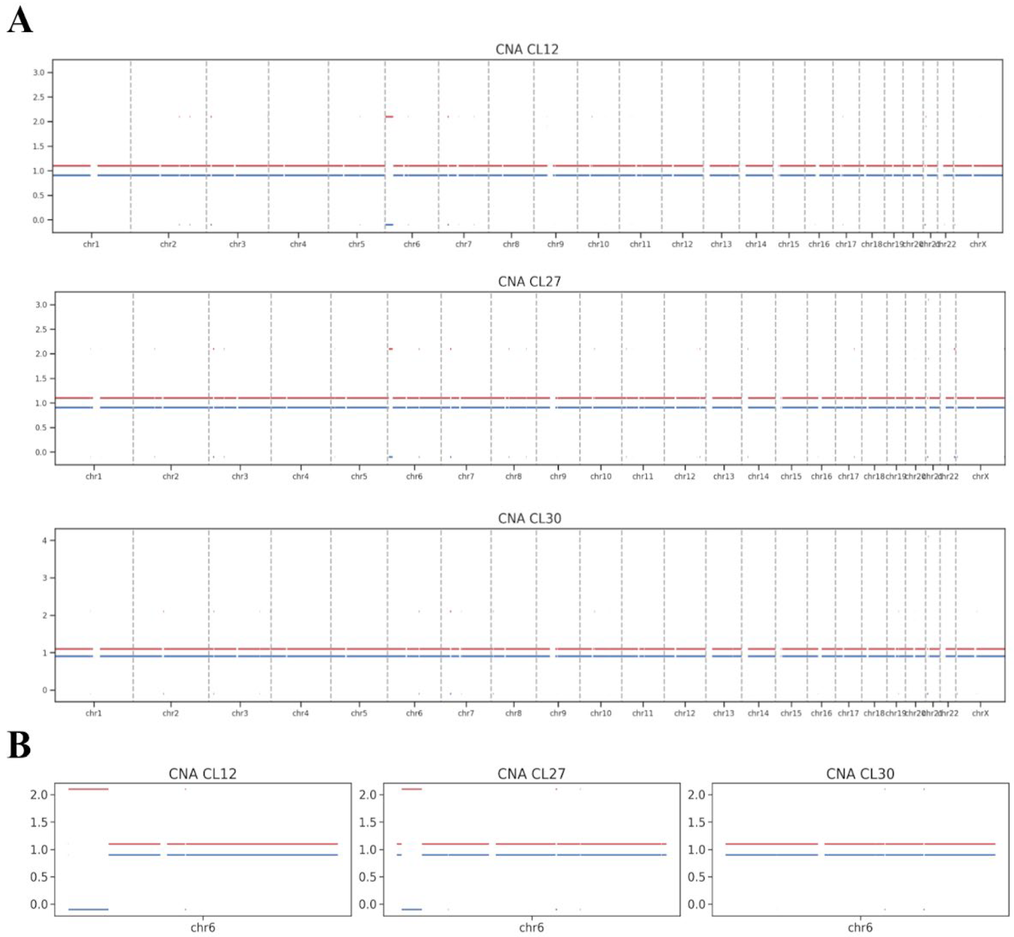 Figure 3. (A) Allele-specific copy number analysis of iPSC lines obtained from the XP-C patient. Whole-genome sequencing (WGS) data for lines CL12 (top), CL27 (middle), and CL30 (bottom) are displayed. The plots show allele-specific copy numbers across the genome, with the red and blue lines representing the two parental haplotypes. The X-axis indicates chromosomal position, and the Y-axis indicates the inferred copy number for each allele. (B) Allele-specific copy number analysis of chromosome 6 iPSC lines.