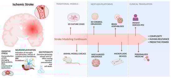 In cerebral ischemia, multiple mechanisms are activated, including inflammation, oxidative stress, and excitotoxicity. In particular, neuroinflammation contributes both to the amplification of neuronal damage through the recruitment of immune cells and to the initiation of reparative processes [5]. Although numerous studies have identified potential therapeutic targets for stroke treatment, most of these strategies have failed to demonstrate efficacy in clinical settings. This gap raises concerns about the actual predictive value of experimental models for such a complex disorder. The lack of successful translation from preclinical studies to patients has been attributed to several factors, including species differences, treatment-related side effects, and the high heterogeneity of stroke in humans. This review aims to examine the main experimental models used for studying IS, highlighting their strengths and limitations. The goal is to provide a critical overview of currently available platforms, from traditional in vitro models to advanced systems such as organoids, assembloids, and microfluidic devices. Emphasis is placed on their ability to faithfully recapitulate pathophysiological processes, their utility in drug discovery and preclinical testing, and the challenges that remain in translating findings into clinical applications. Also, recent reviews, including Pang et al., have critically described advances in NVU modelling and the adoption of human cell-based systems for ischemic stroke research [3]. However, these analyses primarily focus on either NVU-centered platforms or the general transition from 2D to 3D in vitro models, without fully addressing the convergence of bioengineering innovations, such as assembloids, organ-on-chip devices, microfluidic vascularization strategies, and 3D bioprinting approaches, that collectively define the next generation of human-relevant stroke models. The present review aims to fill this gap by providing an integrated overview of these emerging technologies and discussing how their combined use may enhance the translational relevance of ischemic stroke modelling.