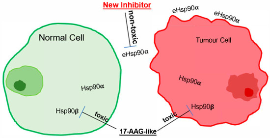 Targeting the non-chaperone functions of eHsp90α is safer and more effective. As schematically illustrated, ATP-binding inhibitors such as 17-AAG cause cellular toxicity in vitro and possibly the reported lines of toxicity in clinical trials by inhibiting the life-supporting role of intracellular Hsp90β. Overwhelming evidence shows that eHsp90α is an alternative, safer, and effective target for a new generation of anti-cancer therapeutics.