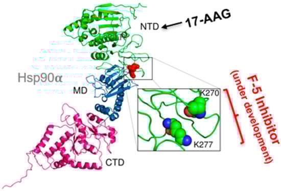 Targeting the dual lysine residues in the F-5 region of eHsp90α. The 115 amino acid (a.a.236–a.a.350) fragment, termed fragment-5 (F-5), between the charged region and middle domain contains the full function of the 732 amino acid full-length eHsp90α in vitro and in vivo [32]. The lysine residues, K-270 and K277, are the “active site” of F-5 [24]. As illustrated, while targeting the ATP-binding site has failed in more than 180 clinical trials, inhibitors targeting the dual lysine site in F-5 are currently being developed.