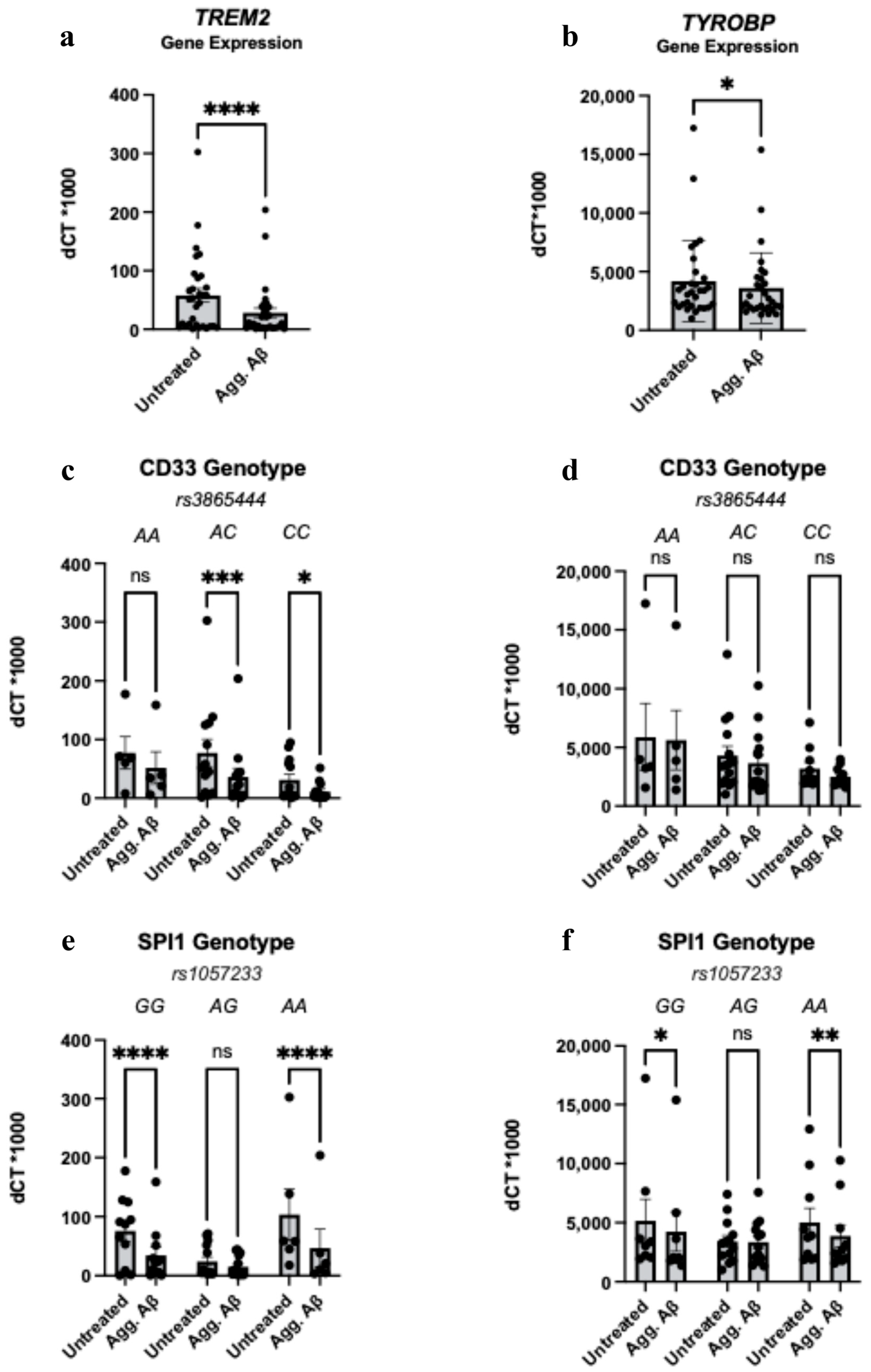 3.3. Aggregated Aβ1-42 Influences TREM2 and TYROBP Transcription in a Genotype-Independent Manner