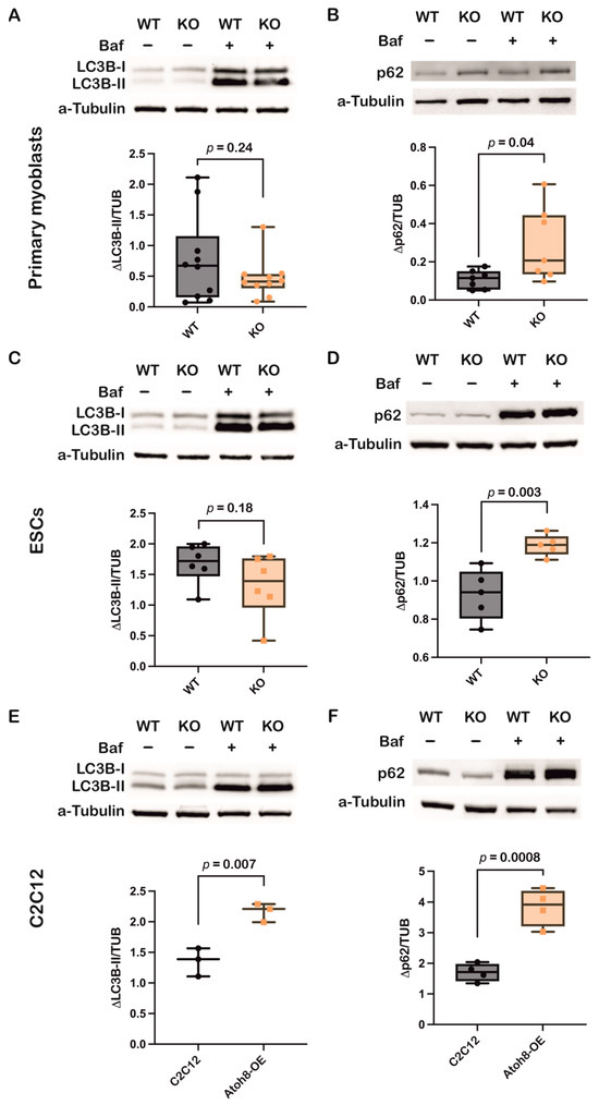 To further validate the role of Atoh8 in autophagy, we evaluated LC3B-II and p62 expression following treatment with Bafilomycin A1, a lysosomal V-ATPase inhibitor that blocks autophagosome-lysosome fusion [44]. Supporting the previous observations, following 24 h treatment of primary myoblasts with Bafilomycin A1 (10 nM), a non-significant decrement in ΔLC3B-II levels (LC3B-II expression in the presence of Bafilomycin A1 and absence of Bafilomycin A1) (WT vs. KO; p = 0.24), and at the same time, a significant increment in Δp62 levels (p62 expression in the presence of Bafilomycin A1 and absence of Bafilomycin A1) was observed (WT vs. KO; p = 0.04), suggesting impairment of autophagy at both autophagosome formation and degradation (Figure 5A,B). Similar results were observed in embryonic stem cells following 24 h of treatment with Bafilomycin A1 (10 nM), LC3B-II (WT vs. KO; p = 0.18), and p62 (WT vs. KO; p = 0.003) (Figure 5C,D). Confirming the role of Atoh8 in autophagy, stable overexpression of Atoh8 in C2C12 myoblasts showed increased accumulation of LC3B-II and p62 following 24 h Bafilomycin A1 (100 nM) treatment, suggesting enhanced autophagy (Figure 5E,F). Overall, these findings corroborate the findings observed in basal conditions.