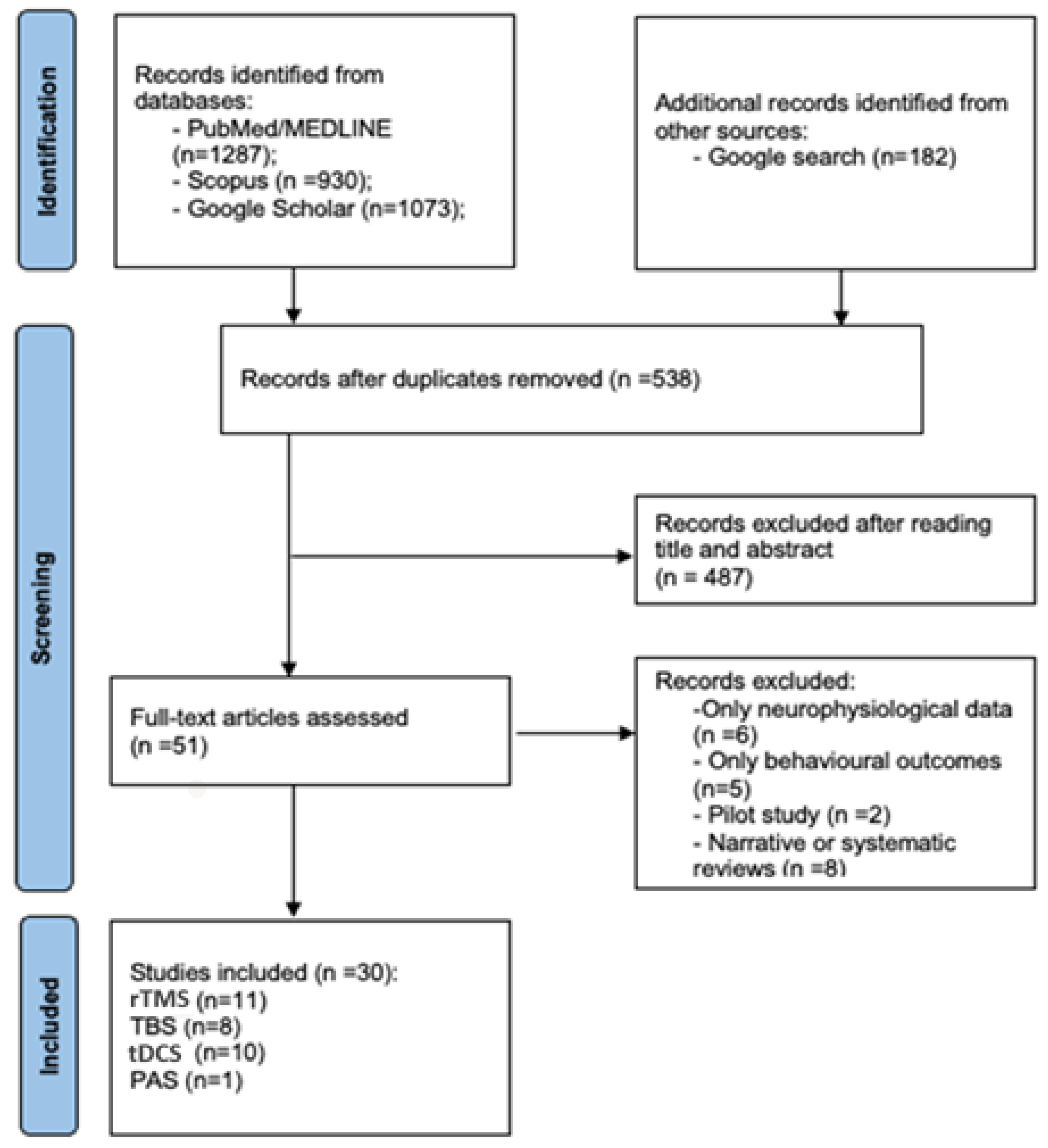 | “repetitive transcranial magnetic stimulation”[Title/Abstract] OR “rTMS”[Title/Abstract] “theta burst stimulation”[Title/Abstract] OR “TBS”[Title/Abstract] ------------------------------------------- “paired associative stimulation”[Title/Abstract] OR “PAS”[Title/Abstract] ------------------------------------------- “transcranial direct current stimulation”[Title/Abstract] OR “tDCS”[Title/Abstract] ------------------------------------------- “transcranial alternating current stimulation”[Title/Abstract] OR “tACS”[Title/Abstract] | AND | “cellular effects”[Title/Abstract] OR “molecular effects”[Title/Abstract] OR “mechanisms”[Title/Abstract] OR “cellular mechanisms”[Title/Abstract] OR “molecular mechanisms”[Title/Abstract] OR “neuroplasticity”[Title/Abstract] OR “gene expression”[Title/Abstract] OR “synaptic plasticity”[Title/Abstract] OR “LTP-like”[Title/Abstract] OR “LTD-like”[Title/Abstract]) | AND | “human”[Title/Abstract] OR “ex vivo”[Title/Abstract] OR “in vivo”[Title/Abstract] OR “animal model”[Title/Abstract] OR “murine”[Title/Abstract] OR “primate”[Title/Abstract] OR “mammalian”[Title/Abstract] OR “cell line”[Title/Abstract] OR “neuron”[Title/Abstract] OR “in vitro”[Title/Abstract] OR “neurodegenerative disease”[Title/Abstract] OR “Alzheimer’s Disease”[Title/Abstract] OR “Parkinson’s Disease”[Title/Abstract] OR “stroke”[Title/Abstract] OR “psychiatric diseases”[Title/Abstract] |