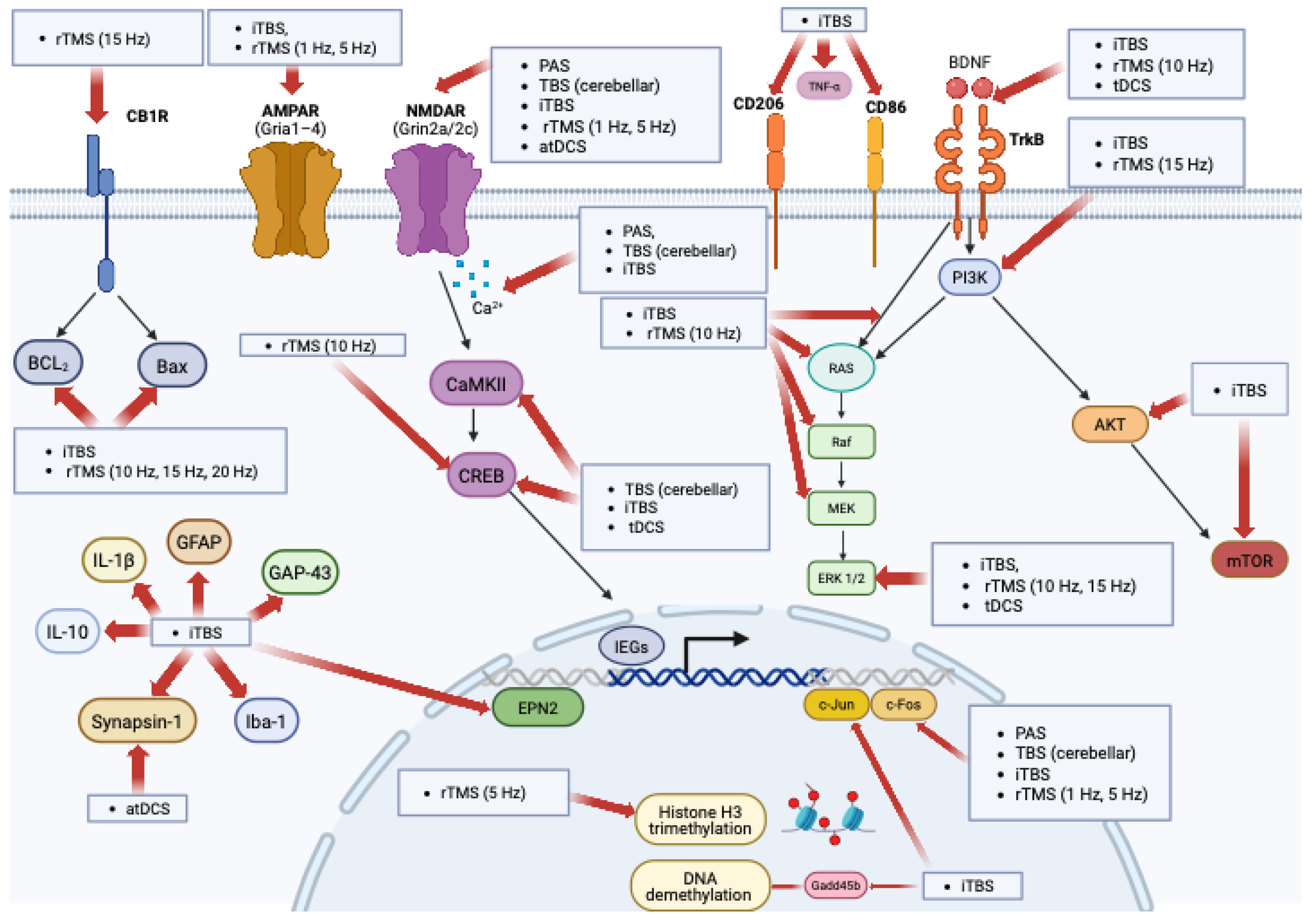 - Across studies, NIBS modulates BDNF–TrkB signaling, neurotransmitter receptor activity (NMDA/AMPA, GABA), and calcium-dependent mechanisms supporting synaptic plasticity