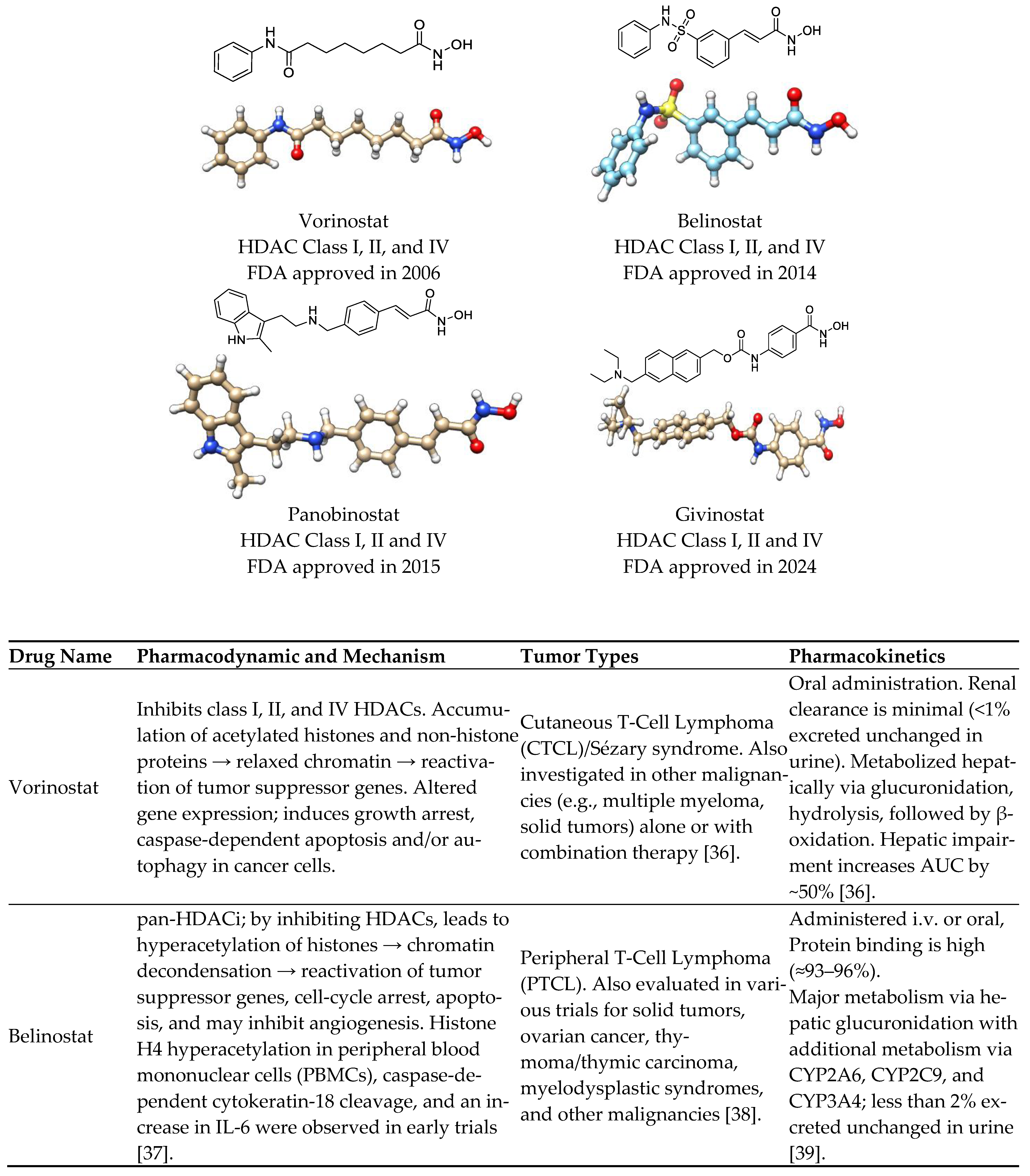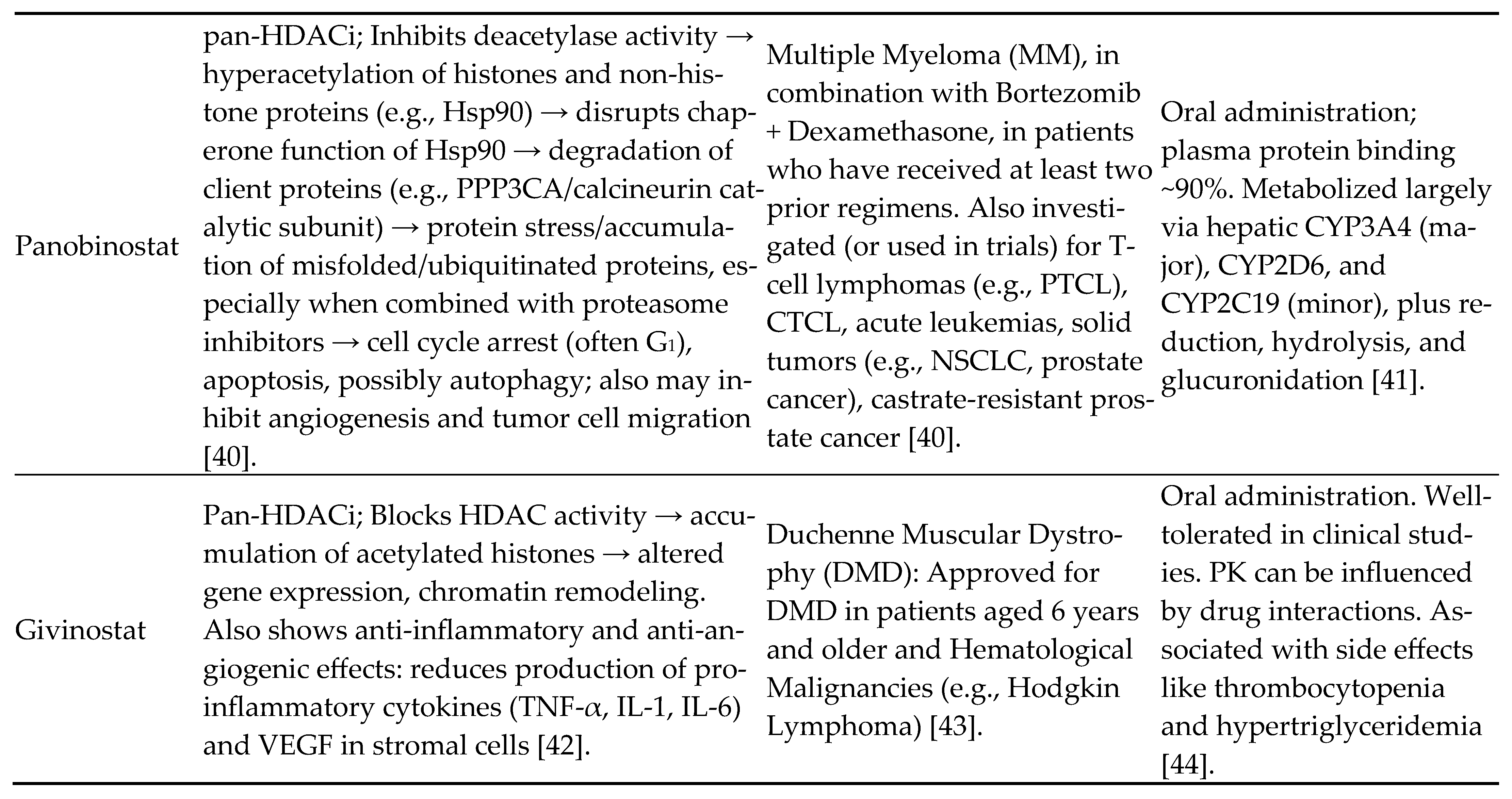 - Talom, A.; Barhoi, A.; Jirpu, T.; Dawn, B.; Ghosh, A. Clinical progress and functional modalities of HDAC inhibitor-based combination therapies in cancer treatment. Clin. Transl. Oncol. 2025, 1–15. [Google Scholar] [CrossRef]