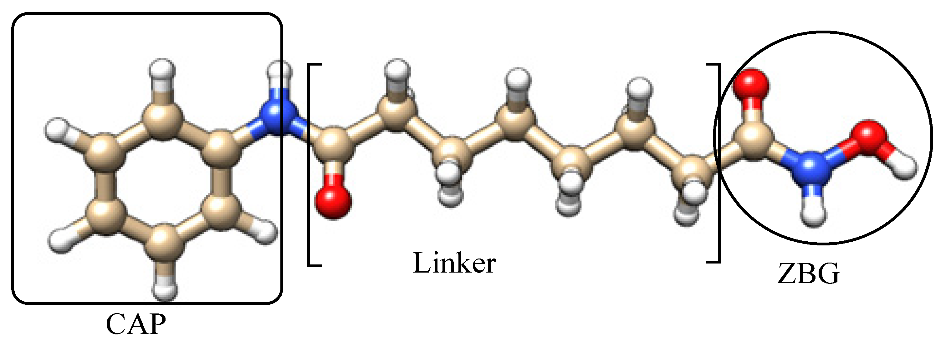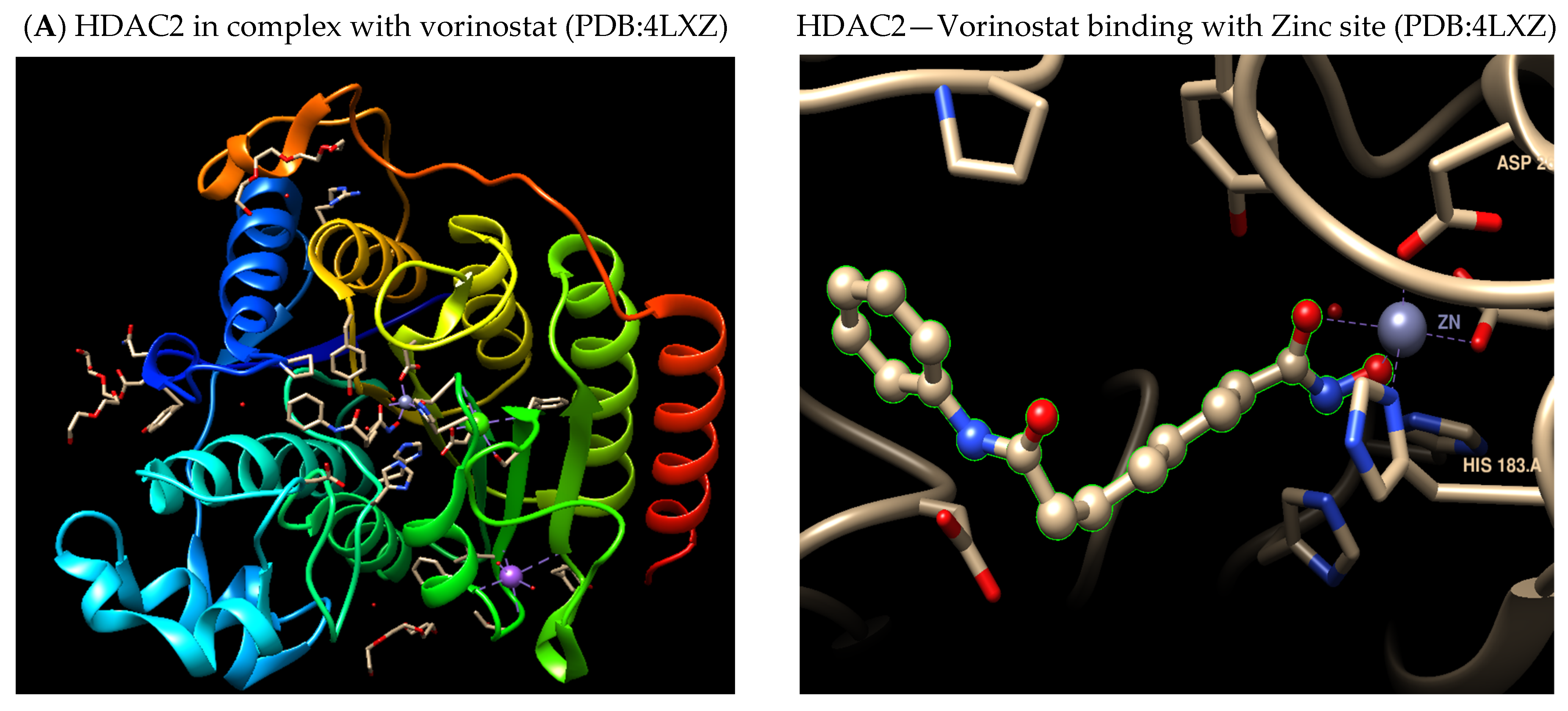 - Sarkar, K.; Debnath, S.; Sen, D.; Kar, S.; Sil, S.K. Crucial Structural Understanding for Selective HDAC8 Inhibition: Common Pharmacophores, Molecular Docking, Molecular Dynamics, and Zinc Binder Analysis of Selective HDAC8 Inhibitors. Med. Chem. 2025, 21, 597–618. [Google Scholar] [CrossRef]