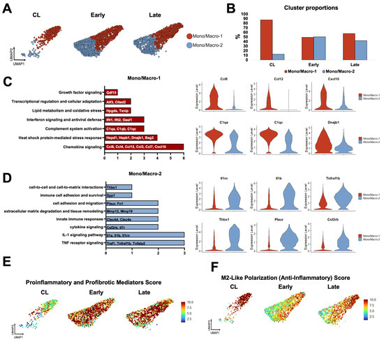 Monocyte/macrophage phenotypes during remodeling of the mouse arteriovenous fistula (AVF): (A,B) Focused UMAPs and relative proportions of monocyte/macrophage phenotypes in contralateral veins (CL) and the outflow veins from early and late AVFs. (C,D) Pathway enrichment analyses and representative differentially expressed genes between the two mono/macro subpopulations. (E,F) Functional profiling of mono/macros over time according to gene signature scores. Scores combine the expression levels of multiple genes with an experimentally curated function.