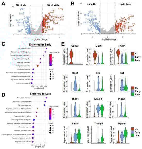 Time-dependent transcriptional changes in murine monocyte/macrophages after arteriovenous fistula (AVF) creation: (A,B) Volcano plots of differentially expressed genes between mono/macros from early or late AVFs and those from contralateral veins (CL). (C,D) Pathway enrichment analyses of mono/macros from early and late AVFs. (E) Time-dependent changes in the RNA expression of selected genes in mono/macros after AVF creation.