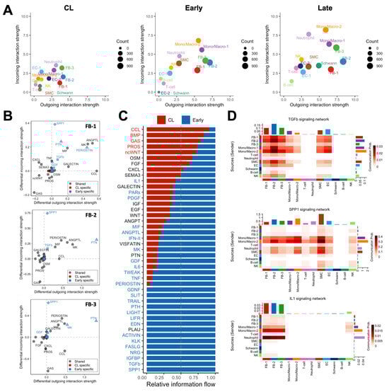 Macrophage–fibroblast crosstalk during remodeling of the mouse arteriovenous fistula (AVF): (A) Global cell-to-cell communication analyses in contralateral veins (CL) and outflow veins from early and late AVFs. The x- and y-axes indicate the strengths of outgoing (ligand secretion) and incoming interactions (receptor binding), respectively, while the sizes of the circles represent the number of predicted interactions. (B) Differential analysis of interactions in the three fibroblasts phenotypes from early AVFs compared with those from contralateral veins. Positive values in the x- and y-axes indicate outgoing and incoming interactions, respectively, that are significantly enhanced in early AVFs. Ligands in blue denote pathways that are specific in early AVFs; those in red are specific in contralateral veins; and ligands in gray indicate pathways that occur in both. Triangles indicate outgoing specific; squares, incoming specific; diamonds, incoming- and outgoing-specific; circles, occur in both. (C) Ranking of cell–cell interactions originating from all cell populations in early AVFs and received by fibroblasts. The red and blue fonts in the ligand names indicate interactions that are statistically significant in contralateral veins and early AVFs, respectively. (D) Heatmap of TGF-b, SPP1, and IL-1 mediated interactions in early AVFs. Senders of ligands are shown on the left, while the receivers are shown at the bottom of each heatmap.