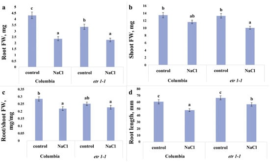 A four-day exposure of the plants from the WT Columbia line and the ethylene-insensitive etr1-1 mutants to the sodium chloride-containing medium resulted in a reduction in root biomass and length in both genotypes (Figure 1a,d). This effect was more pronounced in Columbia plants compared to the mutants. Specifically, root biomass under salinity stress decreased by nearly half in the WT line, whereas the mutant plants exhibited only a 30% reduction. The root length of sodium chloride-treated plants was 20% and 15% lower than that of the control groups for Columbia and etr1-1, respectively. Comparison of root biomass in control plants not subjected to salinity revealed that the mutant plants were inferior to Columbia plants in this parameter (Figure 1a).