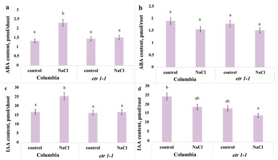 Content of ABA (a,b) and IAA (c,d) in shoots (a,c) and roots (b,d) of single 24-day-old Arabidopsis thaliana plant of the WT ecotype Columbia and ethylene-insensitive etr1-1 mutants, supplied with a H-A solution without salt or supplemented with NaCl. For three days, plants were exposed to a nutrient solution containing sodium chloride (final concentration 150 mM) for three hours. Statistically different means (n = 9) are indicated by different letters (p < 0.05, ANOVA + Duncan’s test).