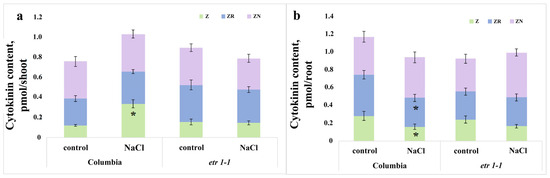 Content of zeatin (Z), its riboside (ZR), and nucleotide (ZN) in shoots (a) and roots (b) of single 24-day-old Arabidopsis thaliana plant of the WT ecotype Columbia and ethylene-insensitive etr1-1 mutants, supplied with a H-A solution without salt or supplemented with NaCl. For three days, plants were exposed to a nutrient solution containing sodium chloride (final concentration 150 mM) for three hours. An asterisk indicates mean hormone content values under salinity that are statistically different from the control plant values (n = 9; p < 0.05, t-test).