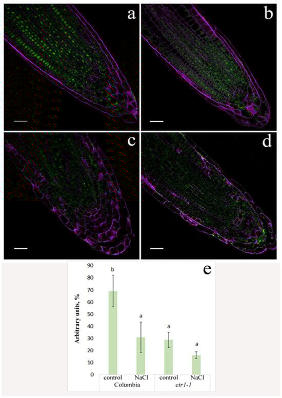 Immunohistochemical staining of ABA (green color) in root tips of 24-day-old Arabidopsis thaliana plants of the WT ecotype Columbia (a,c) and ethylene-insensitive etr1-1 mutants (b,d), supplied with a H-A solution without salt (a,b) or supplemented with NaCl (c,d). Intensity of fluorescence for ABA (e); means ± s.e., arbitrary units, maximal fluorescence taken as 100%, minimal-as 0%. For three days, plants were exposed to a nutrient solution containing sodium chloride (final concentration 150 mM) for three hours. Purple staining—SR2200 Renaissance; green—Alexa488. Scale bar—20 µm. Statistically different means (n = 9) are indicated by different letters (p < 0.05, ANOVA + Duncan’s test).