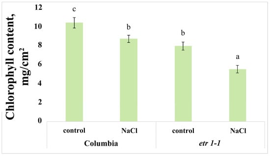 Chlorophyll content decreased under salinity stress in both genotypes. However, the reduction was more pronounced in mutant plants compared to Columbia (17% and 30% decrease relative to their respective controls for Columbia and etr1-1, respectively). Mutant plants not exposed to sodium chloride exhibited significantly lower chlorophyll levels than control Columbia plants (Figure 6). Consequently, under saline conditions, the chlorophyll content in mutants was only 50% of that measured in control Columbia plants.