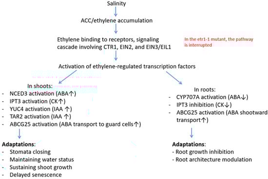 A mechanistic model summarizing proposed interactions among ethylene, ABA, auxin, and cytokinin under salinity. The arrows indicate an increase (↑) or decrease (↓) in hormone levels. Primary signal and perception. Salinity induces osmotic stress and ion toxicity, which serves as the primary signal for activating stress responses. In wild-type plants (Columbia), stress leads to increased production of 1-aminocyclopropane-1-carboxylic acid (ACC), an ethylene precursor, and subsequent ethylene accumulation [2]. Ethylene binds to receptors (e.g., ETR1, ETR2), which, through a signaling cascade involving CTR1, EIN2, and EIN3/EIL1, leads to the activation of ethylene-regulated transcription factors [5]. Ethylene–ABA interaction. Ethylene can increase the expression of key genes involved in ABA biosynthesis, such as NCED3 (9-cis-epoxycarotenoid dioxygenase 3) [49]. This explains the observed ABA accumulation in Columbia plant shoots under saline conditions. Accumulation of ABA in shoots also can occur through its active export into the vascular system via the ABCG25 transporter, which is expressed in parenchyma cells [50]. Ethylene can activate ABA catabolism in root tips through the regulation of CYP707A (ABA-8′-hydroxylase) family genes. This is evidenced by the detected expression of CYP707A (ABA-8′-hydroxylase) family genes in roots [51] and the ability of ethylene to activate the expression of these genes [52]. ABA degradation could be the cause of the observed decrease in ABA levels in Columbia root tips. ABA accumulation in leaves induces stomatal closure (via ion channel activation), which reduces water loss and maintains water status. A decrease in ABA levels in the root meristem removes its inhibitory effect on cell division, which, however, makes root growth more sensitive to the direct inhibitory effect of ethylene (leading to adaptive inhibition of elongation). Ethylene–CK interaction. Under saline conditions, a gradual decrease in IPT3 gene expression was found in tomato plants in the roots and an increase in it in the leaves [53]. Since ethylene production generally increases under saline conditions, it can be assumed that the increase in cytokinin content in shoots and the decrease in roots in our experiments could be due to changes in the expression of the corresponding genes. Maintaining CK levels in shoots delays leaf senescence and preserves chlorophyll content [54]. Ethylene–Auxin interaction. Under saline conditions, plants can accumulate IAA in shoot tissues due to the activation of biosynthesis [55]. In our experiments, ethylene-insensitive mutants did not accumulate IAA in shoots exposed to salt. This suggests the possible involvement of ethylene in modulating auxin levels in shoots. Ethylene modulates auxin transport by regulating the expression and localization of PIN proteins [56]. Under stress, this can lead to IAA redistribution, specifically to a decrease in auxin efflux from shoots to roots. High IAA levels in leaves may contribute to the maintenance of shoot growth [29] under saline conditions. In mutant plants (red), ethylene does not bind to the ETR1 receptor, and the signal transduction cascade is not initiated. Furthermore, no changes in hormonal balance are observed (increased levels of ABA, IAA, and zeatin in shoots, decreased levels of cytokinins in roots, and decreased ABA levels in root tips). Mutant plants with impaired ethylene reception were more susceptible to salinity than plants of the original Columbia line.