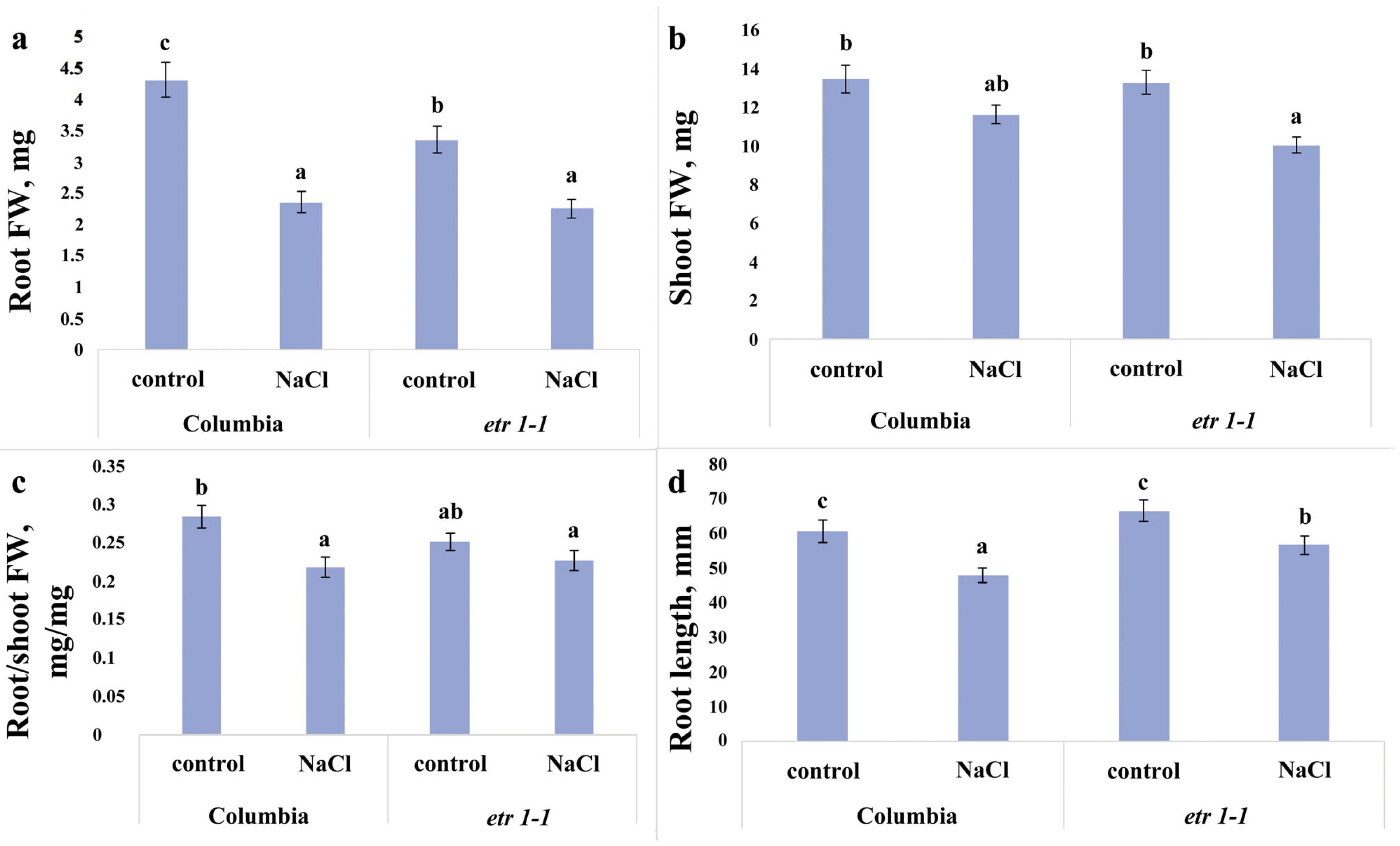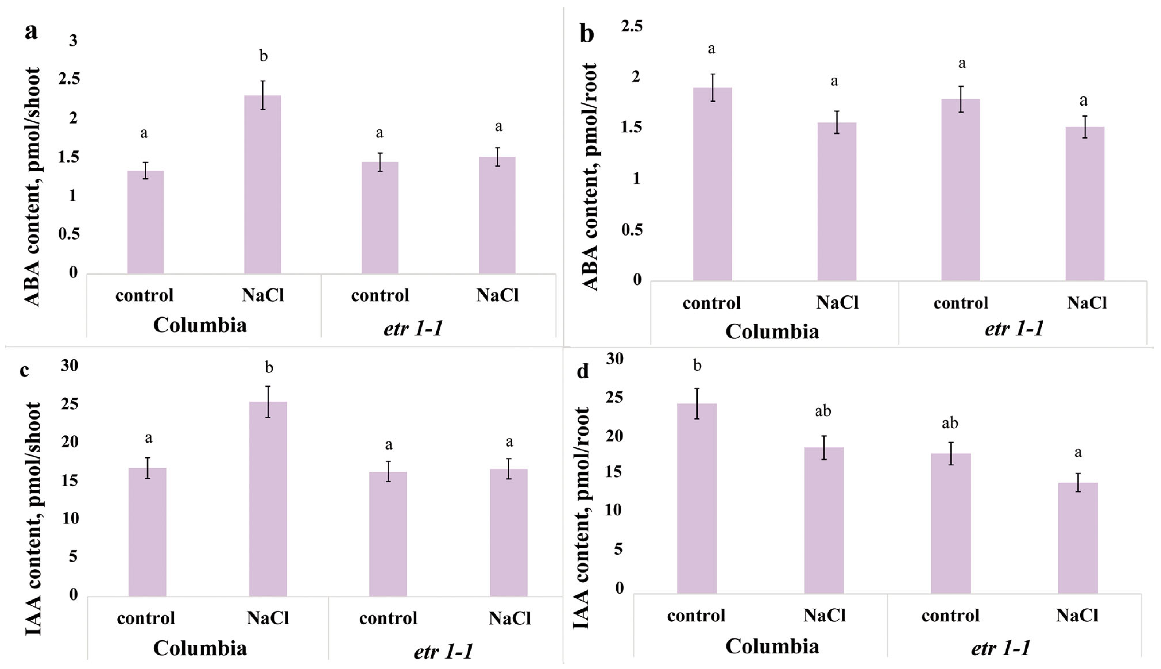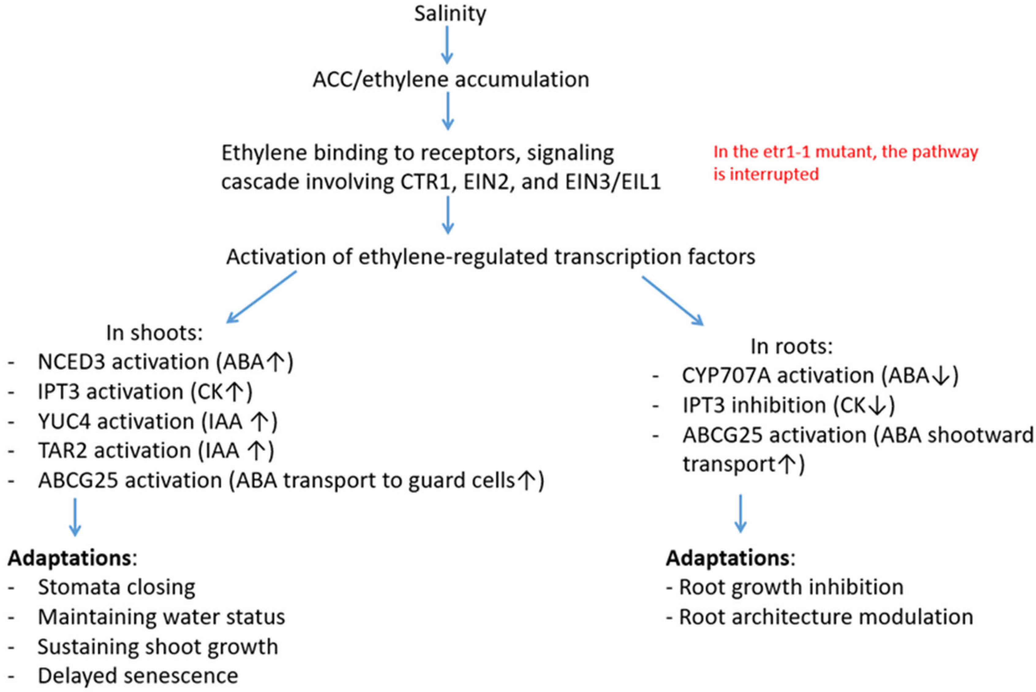 Sevostyanova, A.; Korobova, A.; Akhiyarova, G.; Ivanov, I.; Kudoyarova, G. Impact of the etr1-1 Mutation, Impairing Ethylene Sensitivity, on Hormonal Status and Growth of Arabidopsis thaliana Under Salinity Stress. Cells 2025, 14, 2003. https://doi.org/10.3390/cells14242003