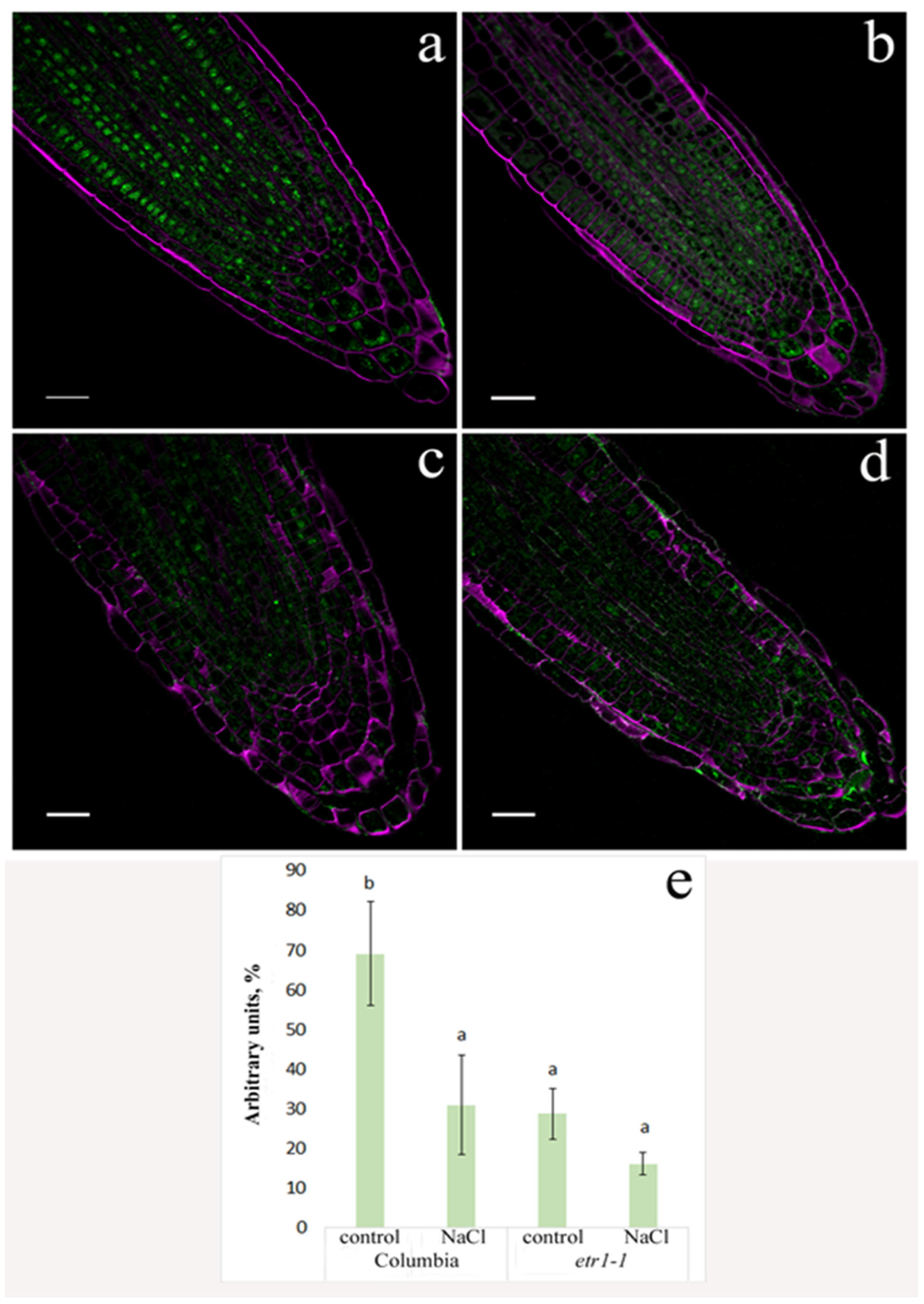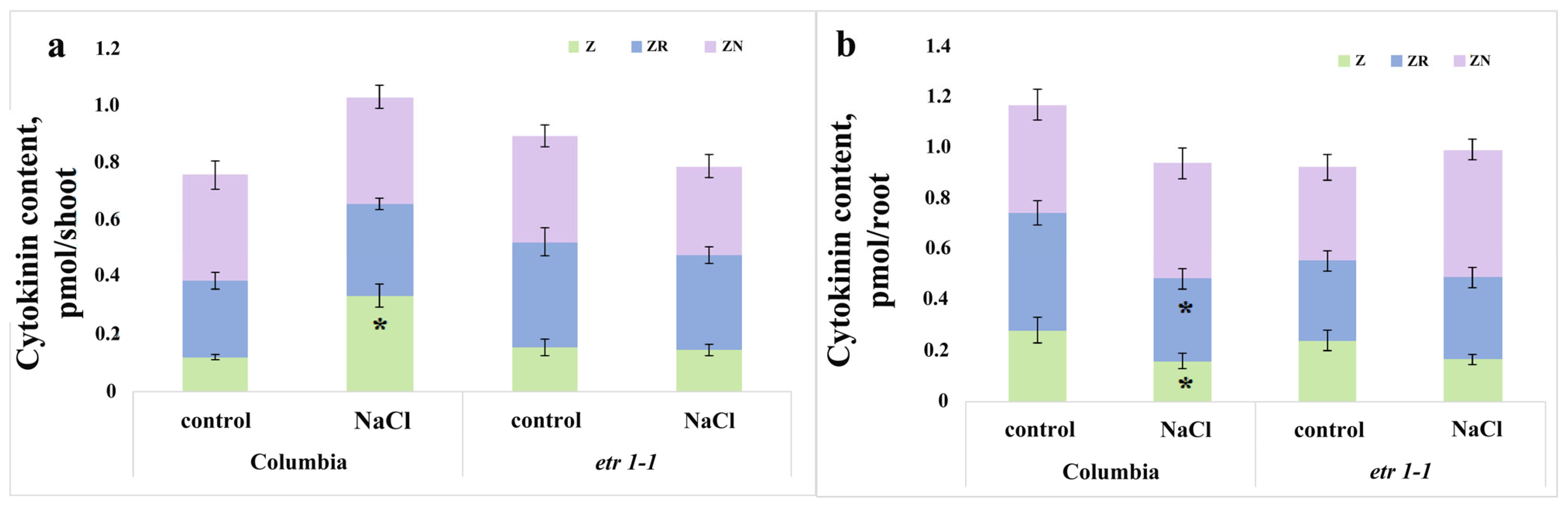 4.2. Alterations in Growth and Hormonal Status of Ethylene-Insensitive Arabidopsis thaliana etr1-1 Mutant Plants Under Sodium Chloride Salinity